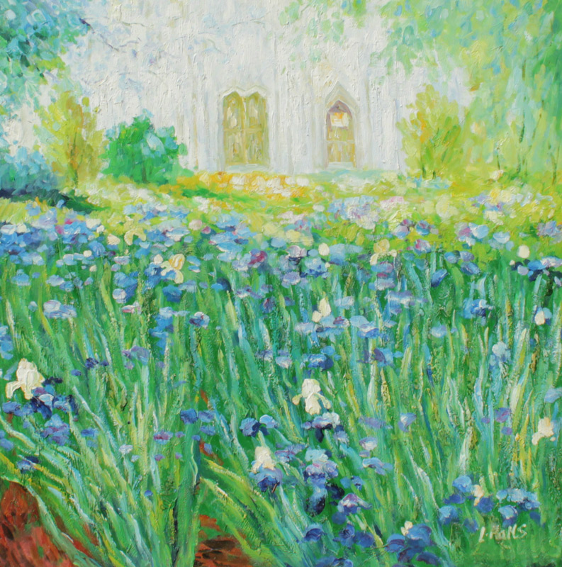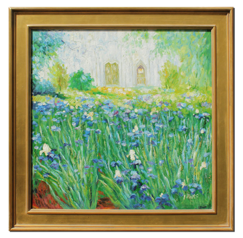 ILLEGIBLY SIGNED PAINTING VIEW OF THE CHURCH FROM THE GLADIOLUS: Oil/Canvas, 30'' x 30'', illegibly signed lower right, encased in custom fine gilded frame 37'' x 37''.