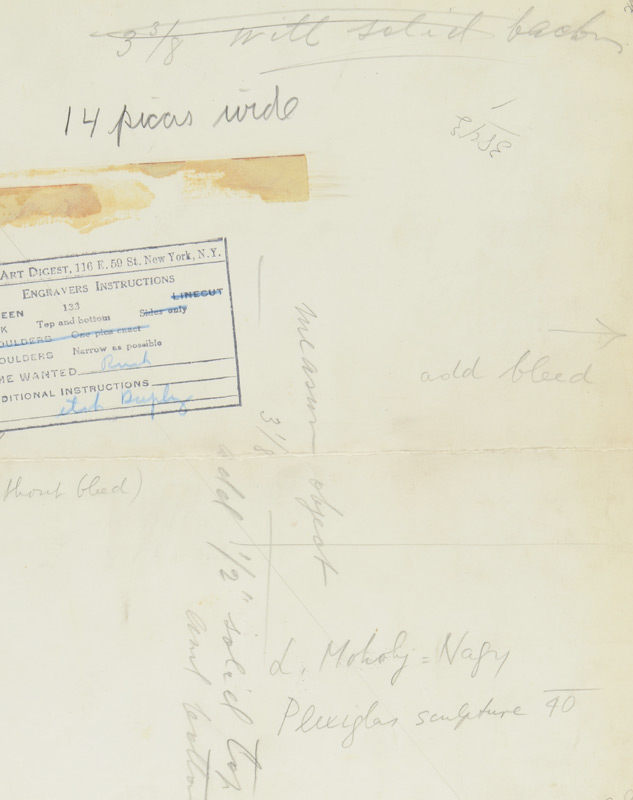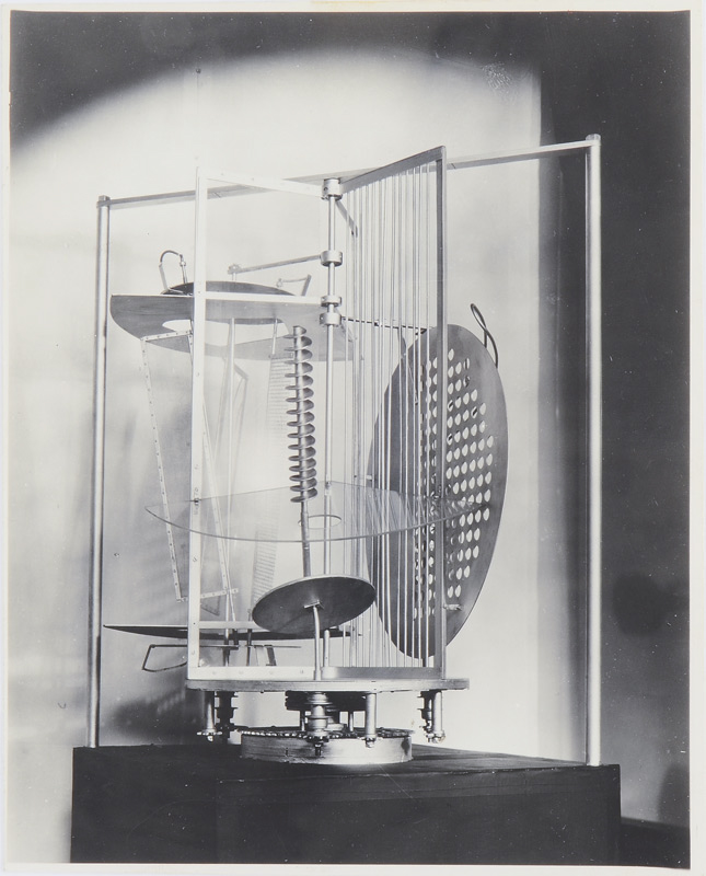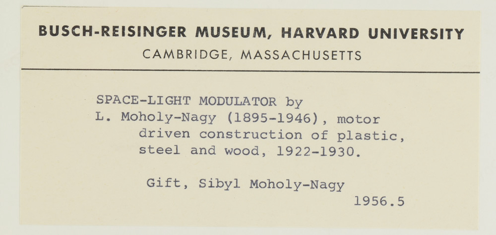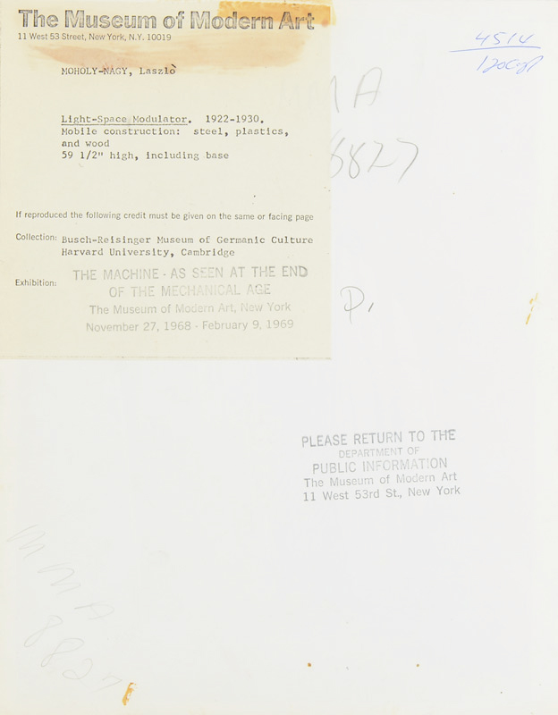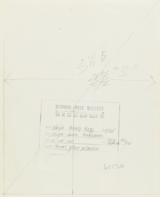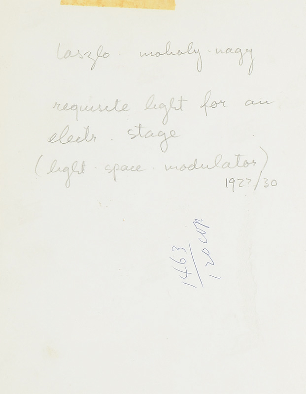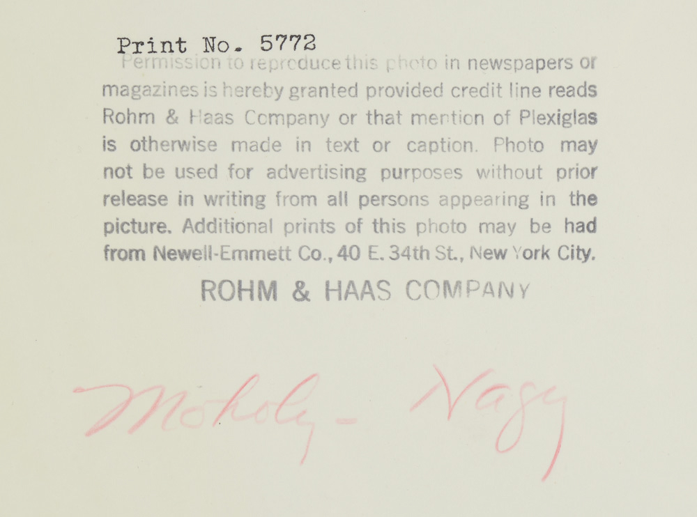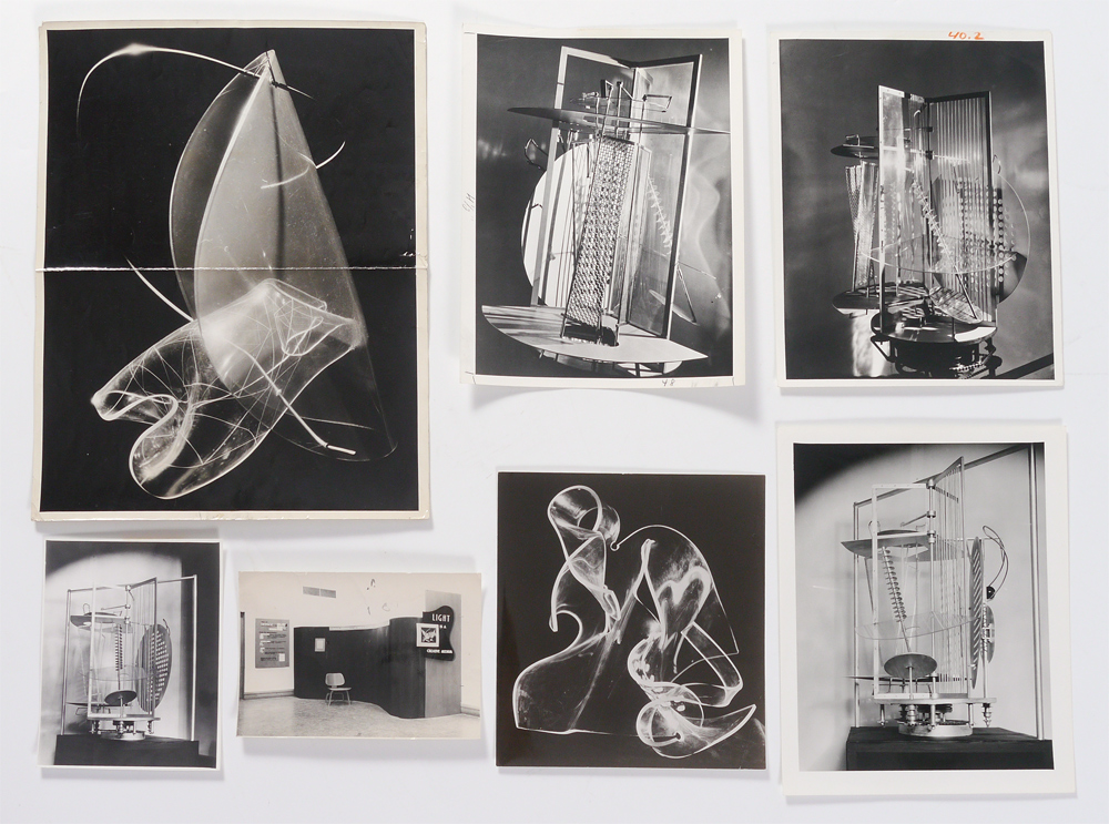 7 PIECE PHOTOGRAPHY LOT OF LASZLO MOHOLY-NAGY WORKS TO INCLUDE: 1) Photograph of Plexiglas sculpture, Rohm & Haas Company copyright verso; 2) Photograph of his Light-Space Modulator (1922-1930), as seen at The Museum of Modern Art New York NY, 10'' x 8''; 3) Light-space Modulator(1922-1930), Photograph, 10'' x 8'', stamped verso from the Howard Wise Gallery, NYC; 4) Light-space Modulator(1922-1930), smaller size, 10'' x 8'', Busch-Reisinger Museum, Harvard, label affixed verso; 5) Light-space Modulator(1922-1930), smaller size, 6 1/4'' X 4 7/8''; 6) Photograph of Laszlo Moholy-Nagy Work ''Photograph of Space Modulator'' by Milton Haberstadt, c. 1940, 14'' x 11'', stamp from ''The Art Digest'' verso; & 7) Photograph of Museum Photogram Exhibition ''Light is a Creative Medium'', photographer unknown, 4 1/2'' x 6 3/4''.