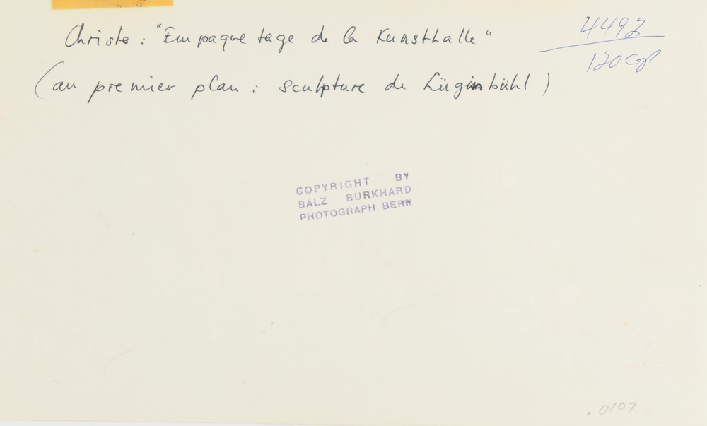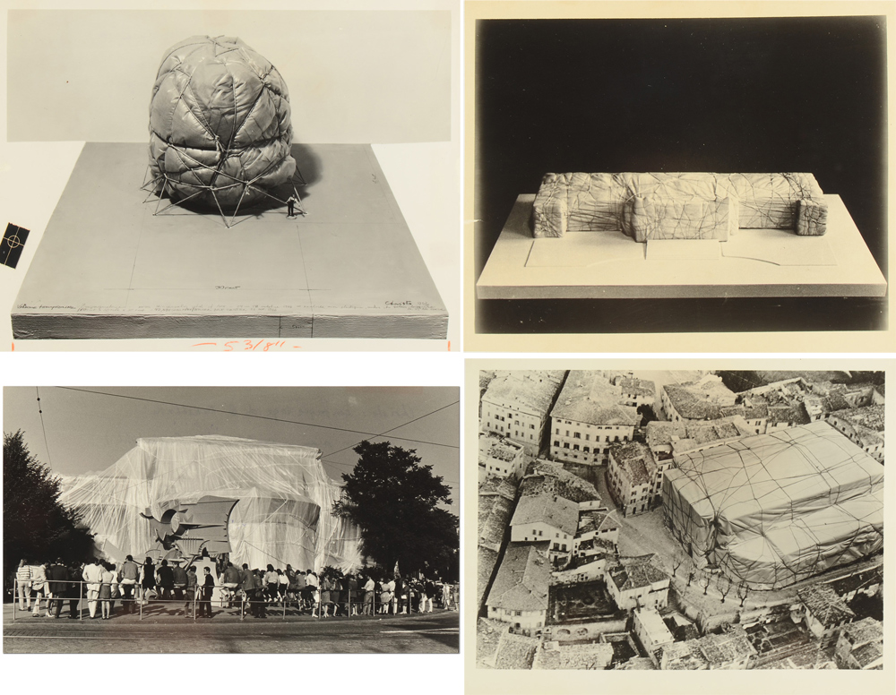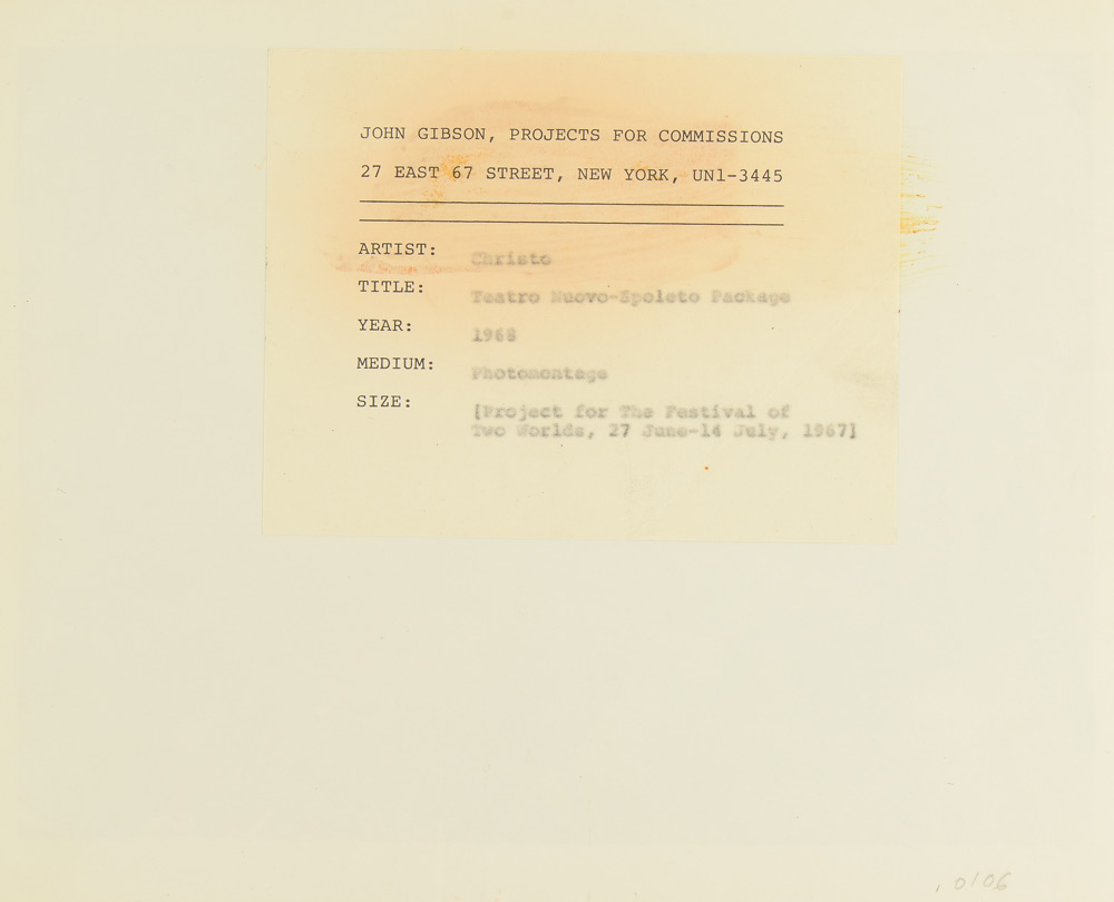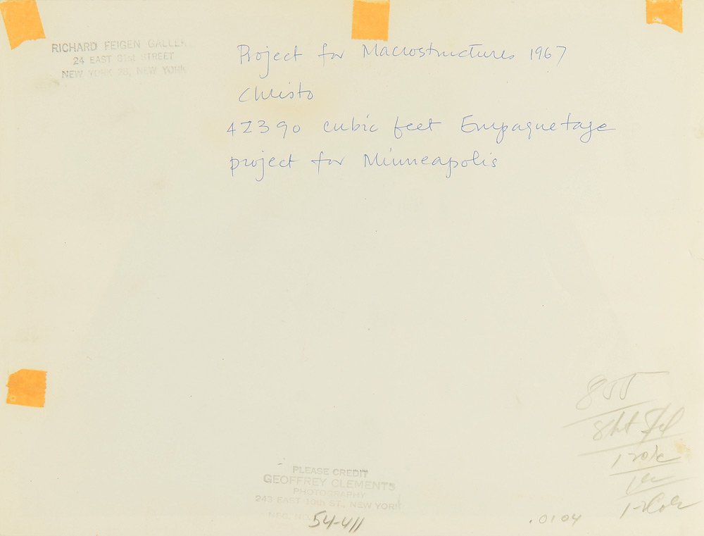 4 PIECE PHOTOGRAPHS OF PROJECT LOT BY CHRISTO (CHRISTO VLADIMIROV JAVACHEFF), (BULGARIAN, 1935): To include; 1) Project for Macrostructures, 1967, Maquette for Walker Art Center, Minneapolis, Minnesota, 1966, 7 1/2'' x 9 7/8'', stamped Richard Fiegen Gallery label verso, along with photo credit to Geoffrey Clements; 2) Label verso reads, ''John Gibson, Projects for Commissions'', ''Teatro Nuovo- Spoleto Package, 1968, Photomontage, (Project for the Festival of Two Worlds, 27 June-14 July 1967), 8'' x 10 1/4''; 3) Label verso reads for John Gibson, Projects for Commissions, Projects of Packages, Storefronts, and Barrels, For the National Gallery of Modern Art, Rome. The National Gallery Package'' Scale Model, 1967, 8 1/4'' x 10''; 4) ''Empaquetage de la Kunsthalle'', 5 1/2'' x 9 1/2'', stamped verso ''Copyright Balz Burkhard''.