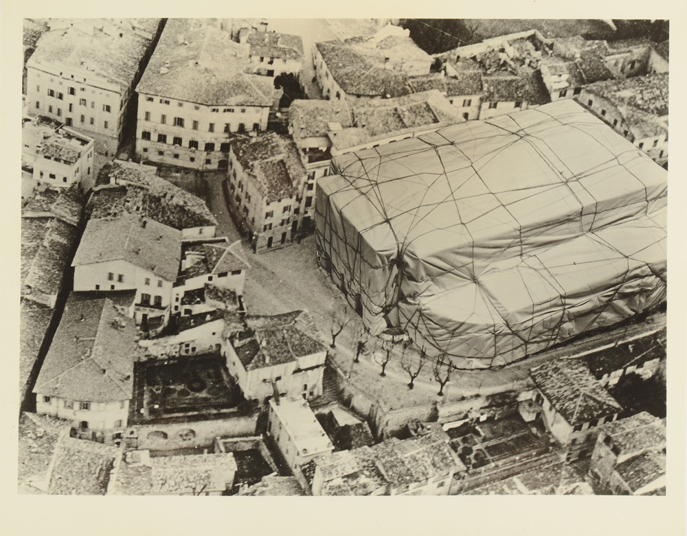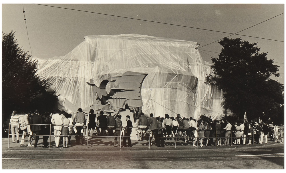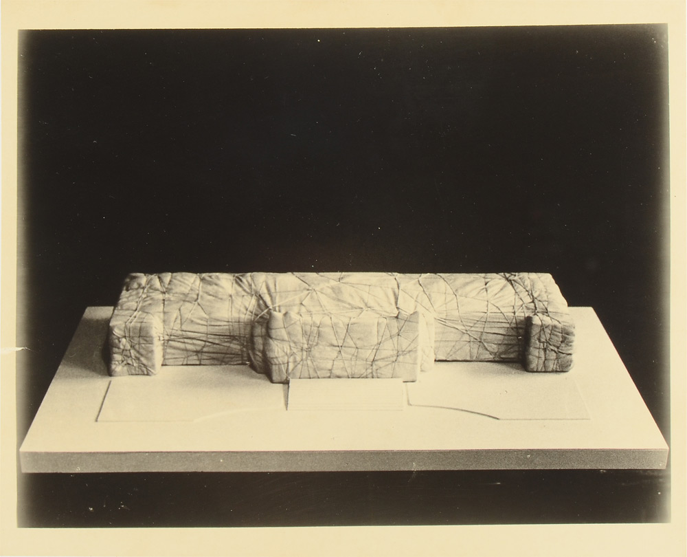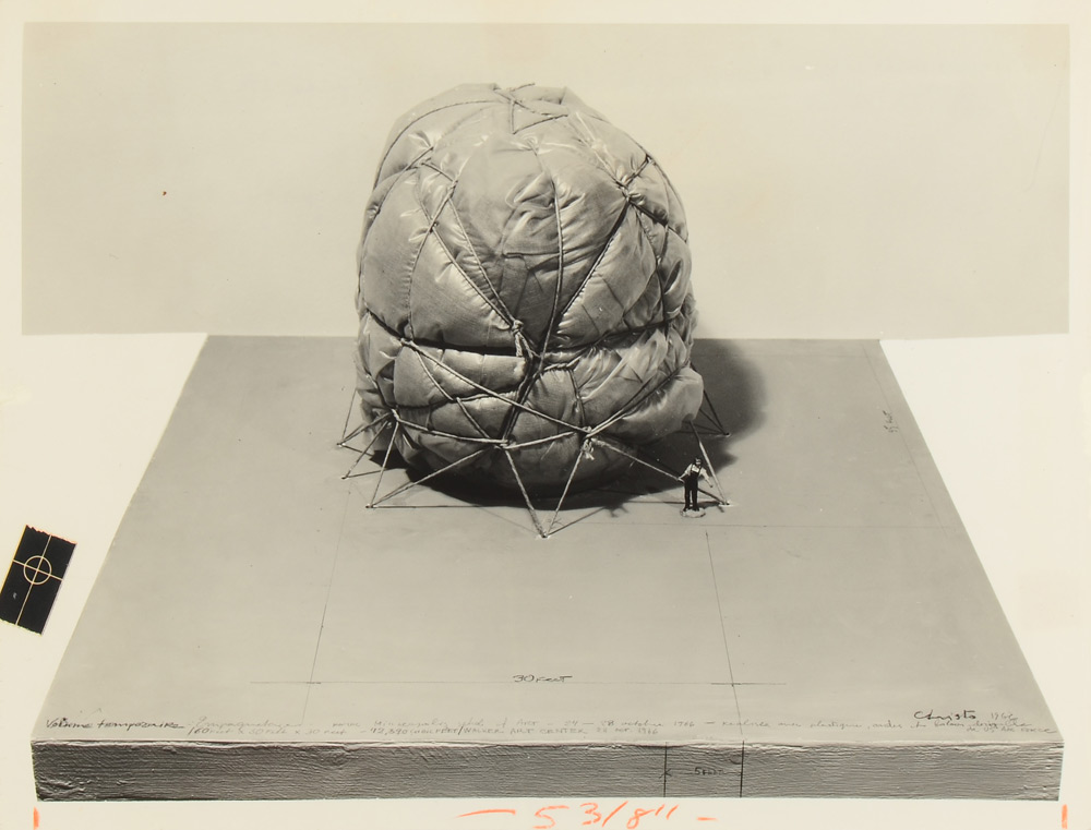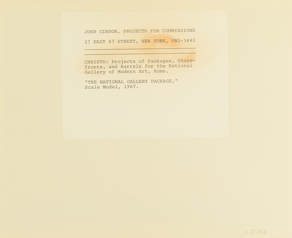 4 PIECE PHOTOGRAPHS OF PROJECT LOT BY CHRISTO (CHRISTO VLADIMIROV JAVACHEFF), (BULGARIAN, 1935): To include; 1) Project for Macrostructures, 1967, Maquette for Walker Art Center, Minneapolis, Minnesota, 1966, 7 1/2'' x 9 7/8'', stamped Richard Fiegen Gallery label verso, along with photo credit to Geoffrey Clements; 2) Label verso reads, ''John Gibson, Projects for Commissions'', ''Teatro Nuovo- Spoleto Package, 1968, Photomontage, (Project for the Festival of Two Worlds, 27 June-14 July 1967), 8'' x 10 1/4''; 3) Label verso reads for John Gibson, Projects for Commissions, Projects of Packages, Storefronts, and Barrels, For the National Gallery of Modern Art, Rome. The National Gallery Package'' Scale Model, 1967, 8 1/4'' x 10''; 4) ''Empaquetage de la Kunsthalle'', 5 1/2'' x 9 1/2'', stamped verso ''Copyright Balz Burkhard''.