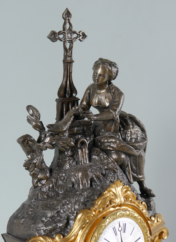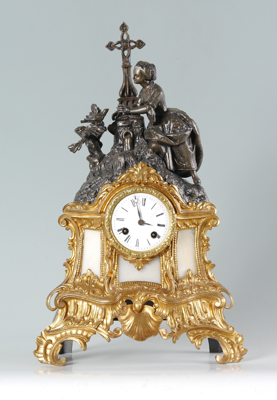 FRENCH FIGURAL SHELF CLOCK: Case with cast metal finial of figural maiden kneeling at a cross with bird on branch, shaped metal body, gilt decorated cast metal front, alabaster inserts. Porcelain dial with Roman numerals, Japy Freres time and strike movement. Measures 18 1/4'' h. x 11 1/4'' x 5 1/4''.