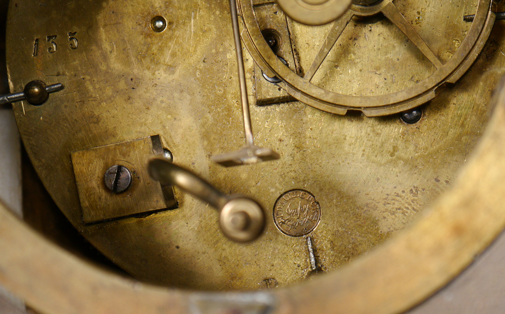 CONDITION: Hairline cracks to dial, movement is loose, currently not running correctly. Key, pendulum and bell in office.