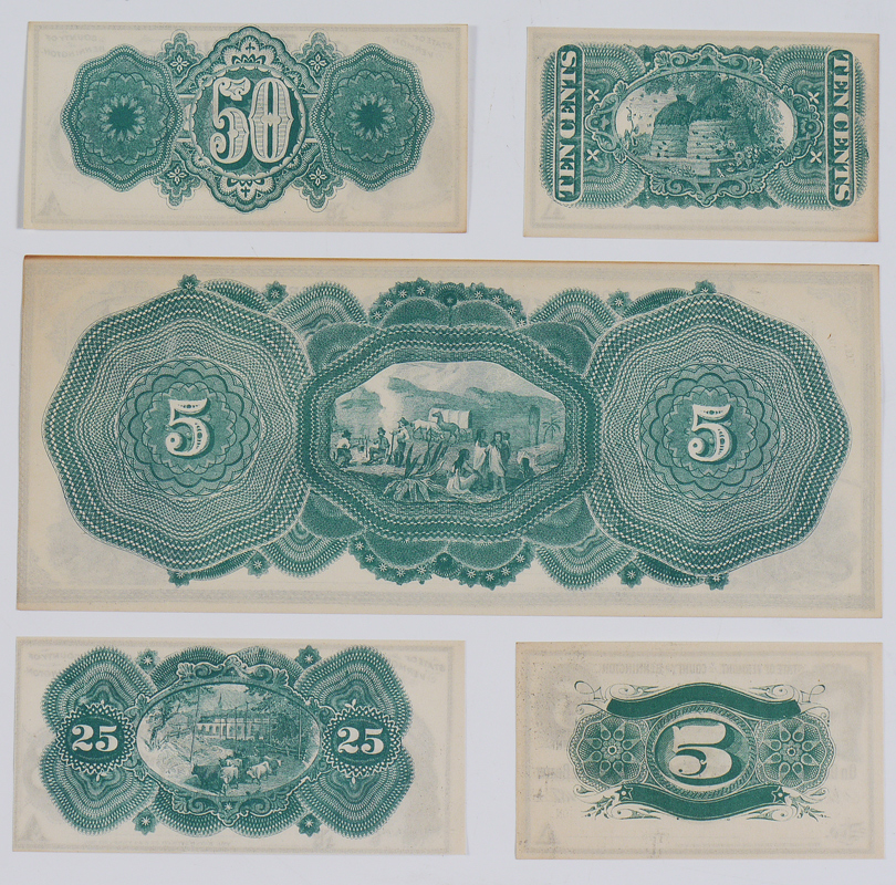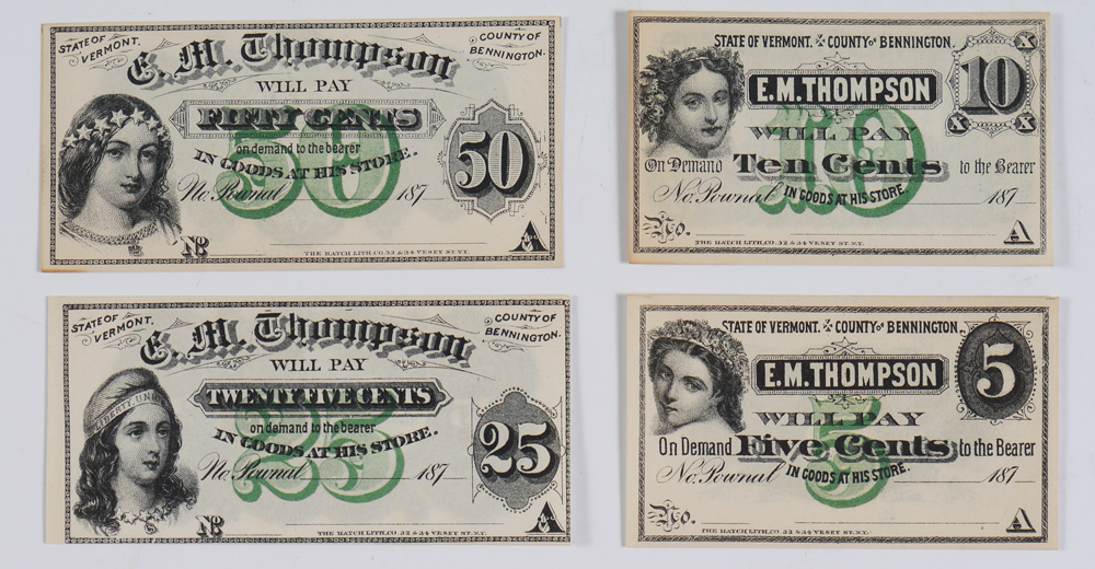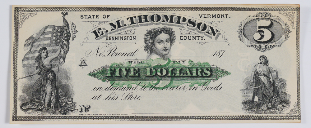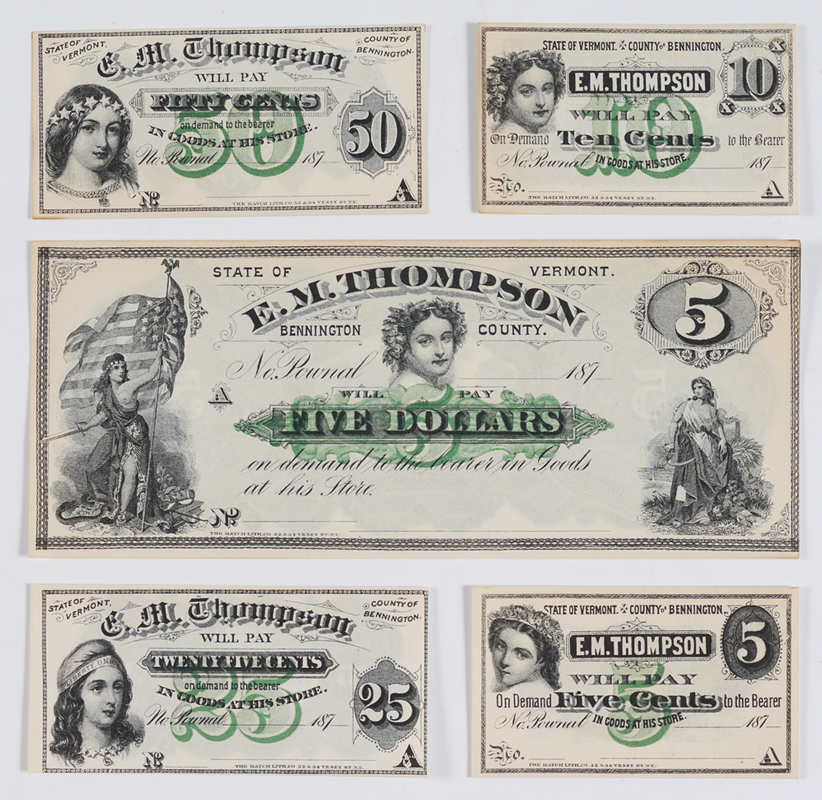 5 E. M. THOMPSON 1870'S MERCHANT SCRIPT NOTES: 5 script notes from Bennington County, Vermont to include a $5, 50 cent, 25 cent, 10 cent and 5 cent notes. Unfolded, ungraded, largest note 7 1/4'' x 3''.