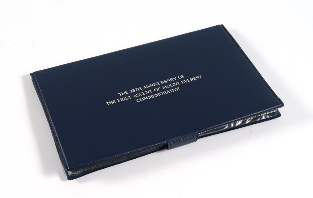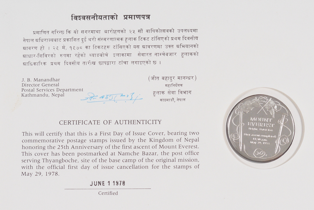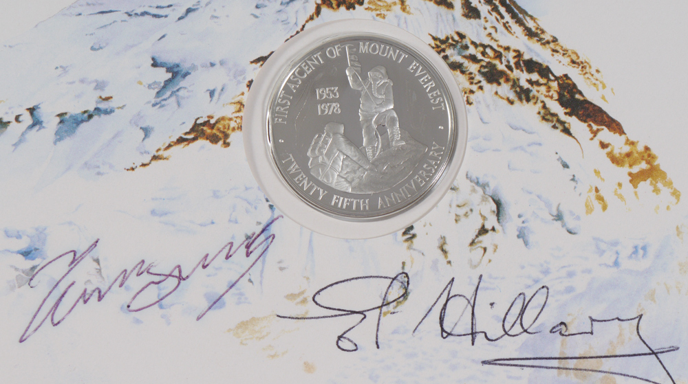 EDMUND HILLARY & TENZING NORGAY SIGNED FIRST DAY COVER ENVELOPE: From the original 1996 Early American Numismatic Auctions catalog: ''Tenzing Norgay & Edmund Hillary, Conquerors of Mt. Everest. Postal Numismatic Cover (PNC), Signed, ''Tenzing Norgay'' and ''Edmund Hillary'', commemorating the 25th Anniversary of the first ascent of MT. Everest, postmarked MAy 29th, 1978, with silver Franklin Mint coin, as made. Posted with Nepalese stamps. Housed in an attractive blue vinyl holder.'' Holders measures 5 1/4'' x 8 3/4''.
