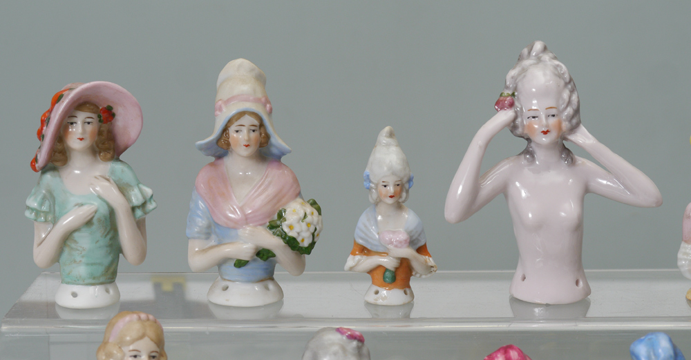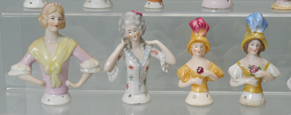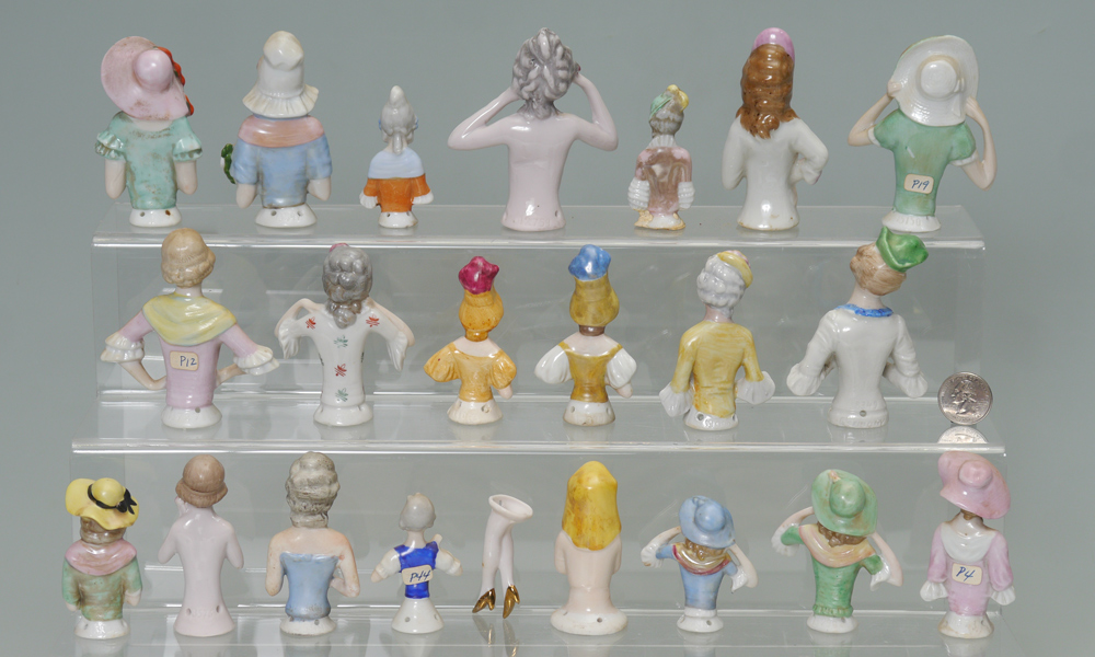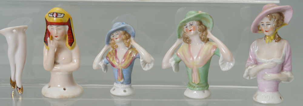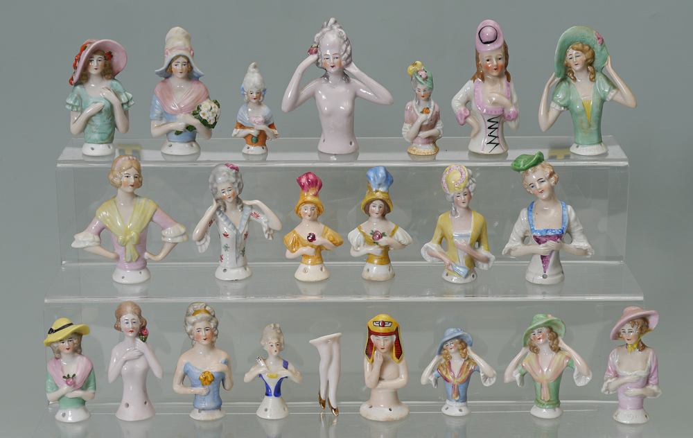 PORCELAIN HALF DOLLS: Part of an estate collection of porcelain pin cushion half dolls. Approx. 22 pieces, some marked Germany, Foreign, and impressed numbers. Measures from 2 1/4'' - 3 3/4''.
