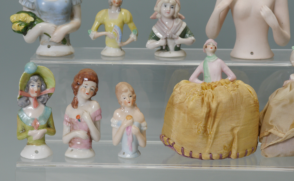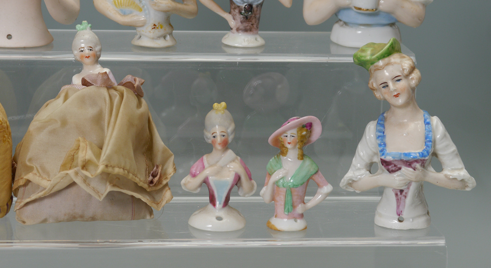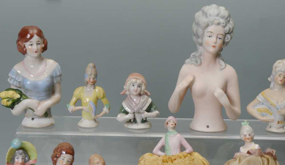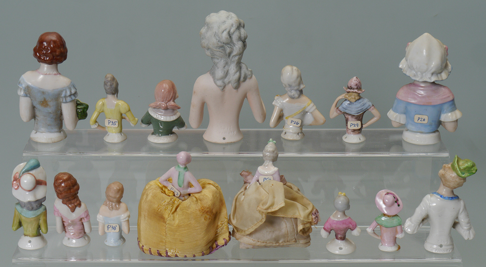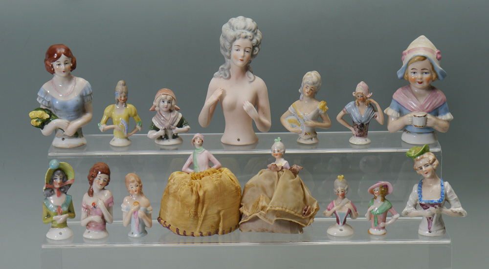 14 PORCELAIN HALF DOLLS: To include the large nude with a mat finish and miniature flapper with the pin cushion skirt. Marks include Foreign, impressed numbers and Germany. Measure approx. 2'' - 5 1/2''.