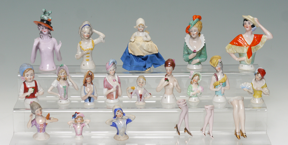 20 PIECE COLLECTION PORCELAIN HALF DOLLS: In varying positions, Dutch girls, sassy hats, 3 sets of legs. Some marked Germany, some with impressed numbers, one marked Japan, some unmarked. The tallest measures 4 1/2'' tall, smallest 2''. Legs measure 2 1/4'' - 3''.