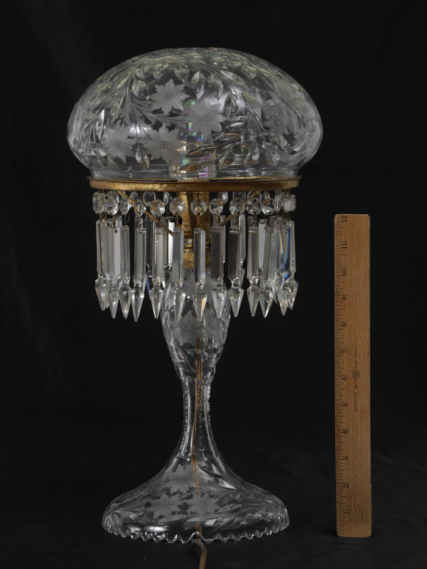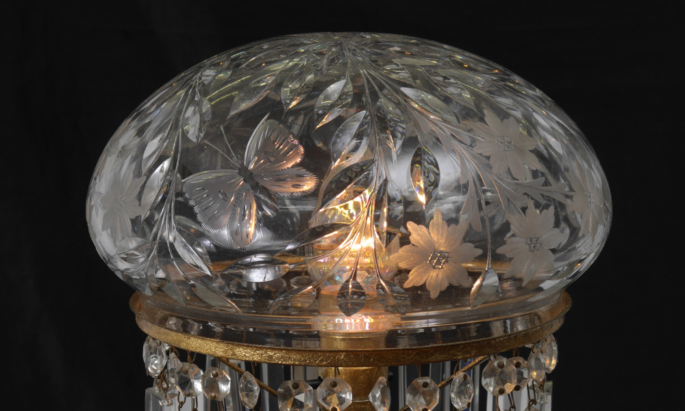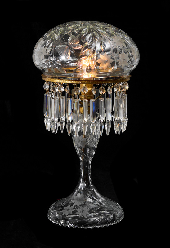 CUT GLASS LAMP attrib. PAIRPOINT: Cut glass shade and base cut in a classic Pairpoint butterfly and flower design. Overall approx. 19''h. x 10''diam at widest point.