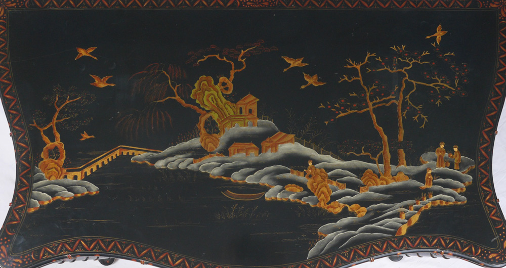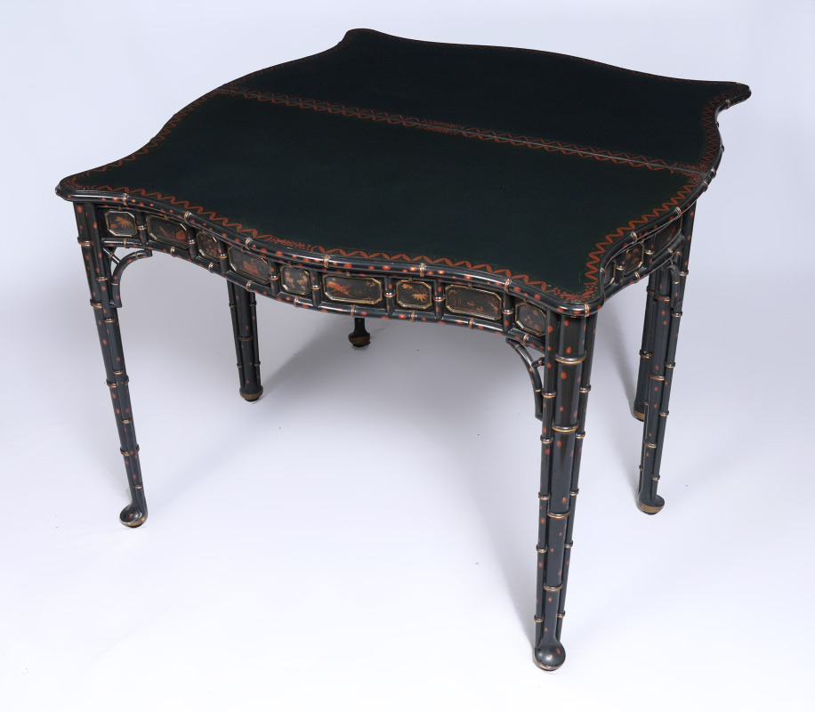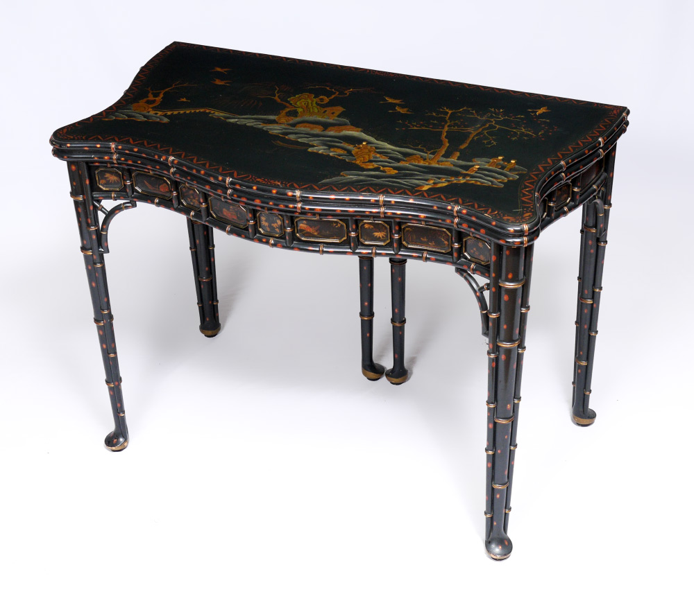 BAKER FURNITURE CHINOISERIE GAME TABLE: From the Stately Homes of England and Scotland Collection, Selected by Sir Humphrey Wakefield. A chinoiserie decorated flip top table, shaped top over faux bamboo legs ending in pad feet. Full paper label. Measures 30 1/2''h. x 40 1/2'' x 22''.