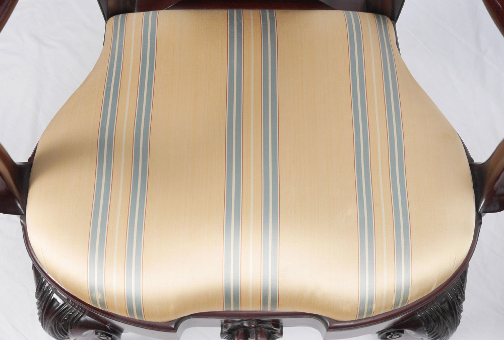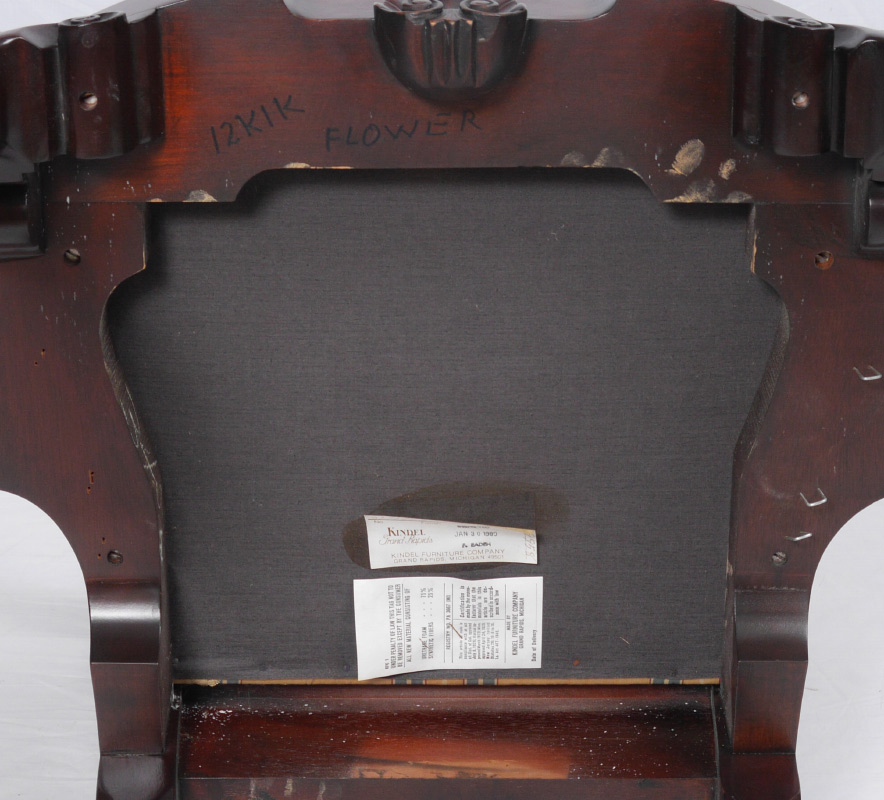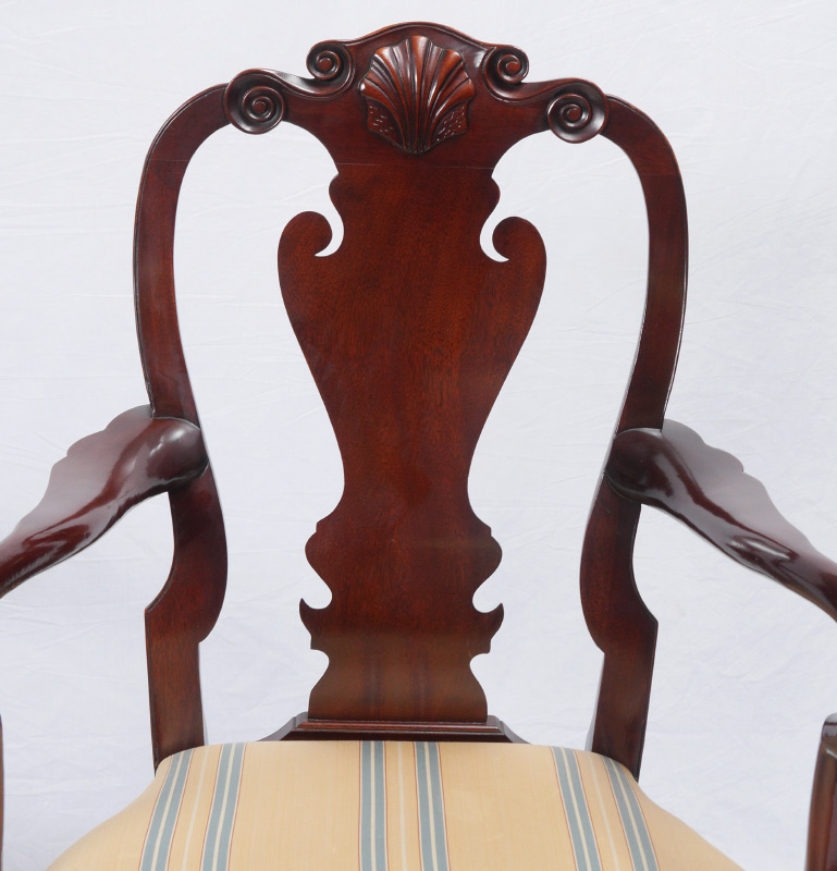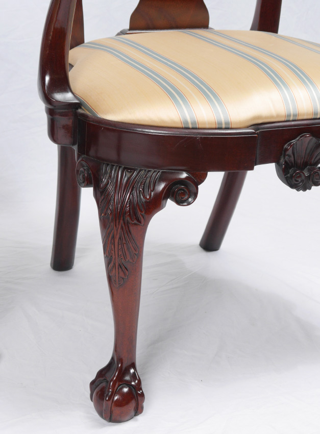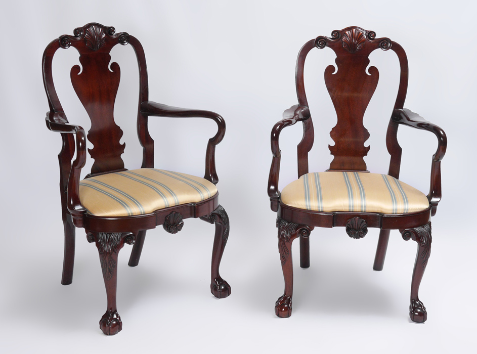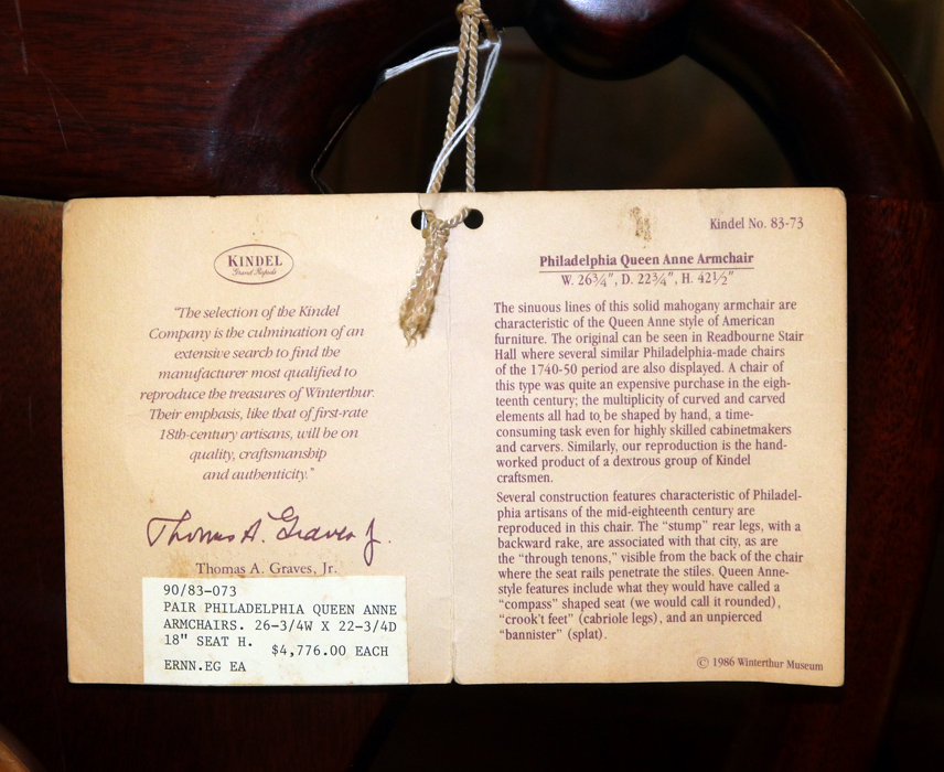 PAIR KINDEL FURNITURE WINTERTHUR COLLECTION QUEEN ANNE ARMCHAIRS: A fine pair of Kindel Mahogany Winterthur Collection Queen Anne Armchairs having the very same hand-carved elements (shells, volutes, acanthus leaves, and ball and claw feet) and crafted from the same materials as the originals that were made around 1760 in Philadelphia. They are considered by many scholars and collectors to be one of the finest examples of the Queen Anne style in Philadelphia. One of the originals sold at Christie's in 2002 for $666,000, a world record for a single wooden side chair. 42 1/2''h. x 26''w. x 22''d., 20'' Seat height, 29 1/4'' arm height. Palm Beach / New York Estate of a Gentleman and Dignitary.