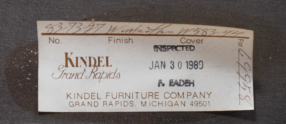 CONDITION: Wear to fabric, especially at front from use on both. Small water stain on one seat cushion.