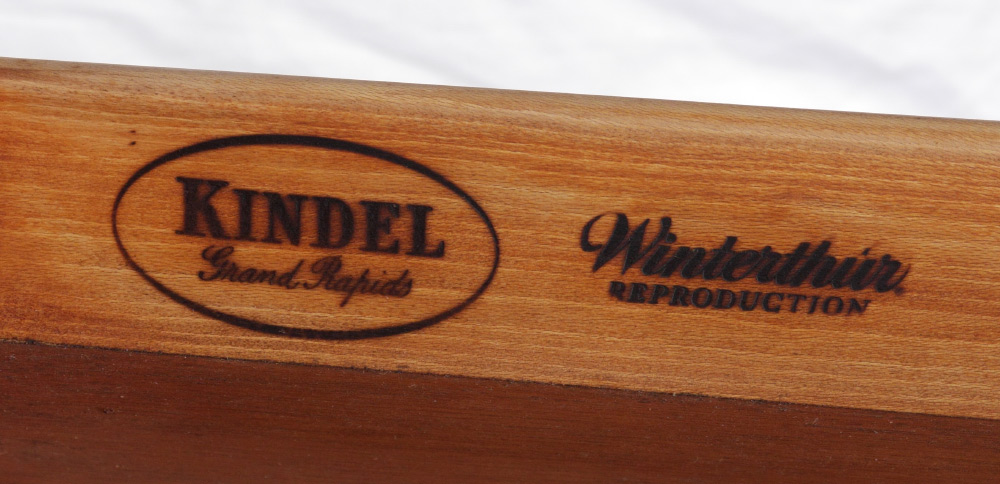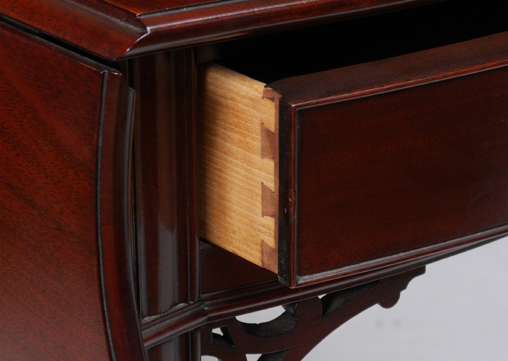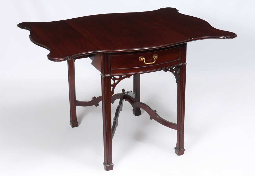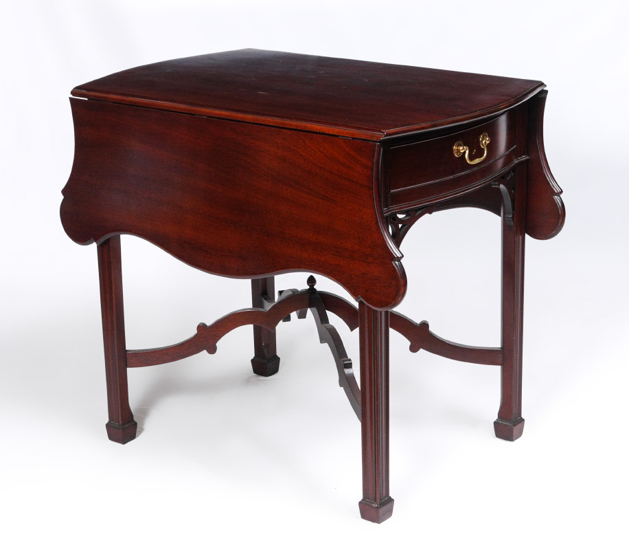 KINDEL WINTERTHUR COLLECTION MAHOGANY DROP LEAF TABLE: Double drop leaves with cookie corners, single drawer over fretwork decoration, shaped stretchers, fluted legs. 28 1/2'' x 21'' x 32''. For a pair see next lot 1026A.