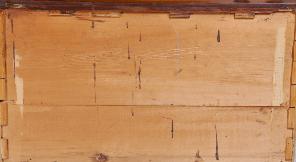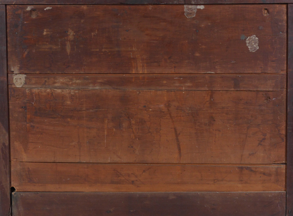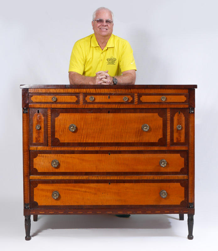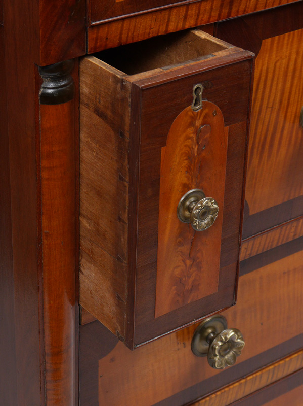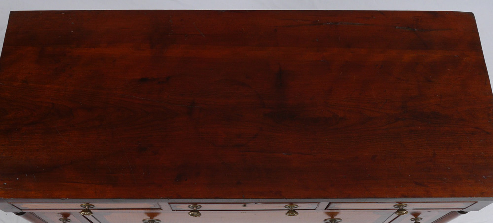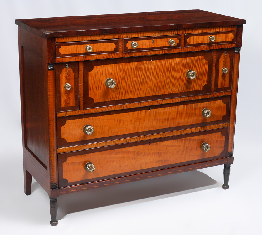 19TH CENTURY CHERRY & TIGER MAPLE SERVER / CELLARETTE: In the manner of Thomas Seymour, 3 drawer over single drawer surmounted by cellarette drawer either side with locks, 2 additional lower full length drawers, original brass pulls, turned legs. 42 3/4'' h. x 47 3/4'' x 20 1/2''.