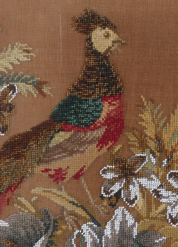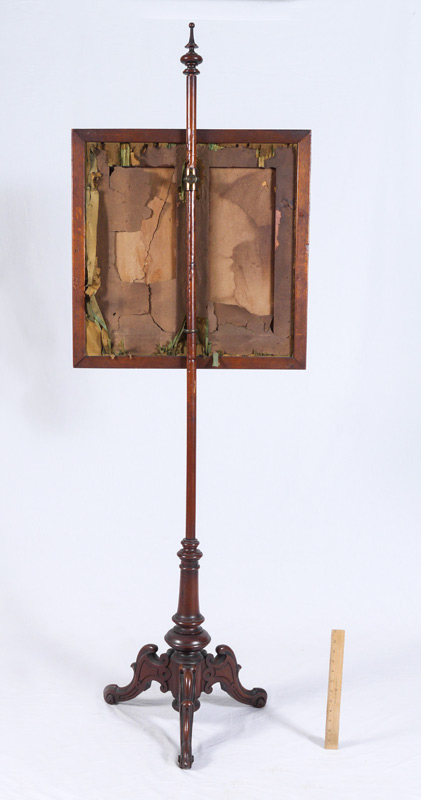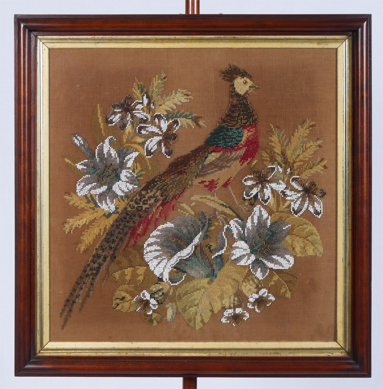 VICTORIAN BEADED PANEL POLE FIREPLACE SCREEN: Circa mid 19th century turned rose wood pole with carved splayed legs. 67 3/4'' h. x 17''. Beaded screen with peacock & floral motif, 22 1/2'' x 22 1/2'' x 2''.