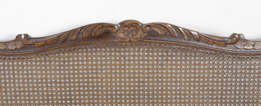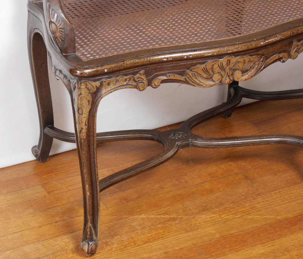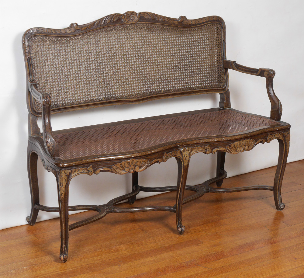 PROVINCIAL LOUIS XV STYLE SETTEE: Early 20th century, the caned back surmounted by a foliate-carved crest and joined by scrolling arms, cane seat with foliate carved double apron on cabriole legs ending in scrolled toes. Double cross stretcher.