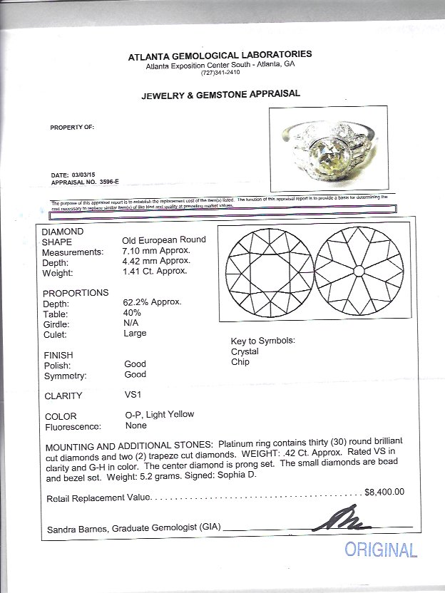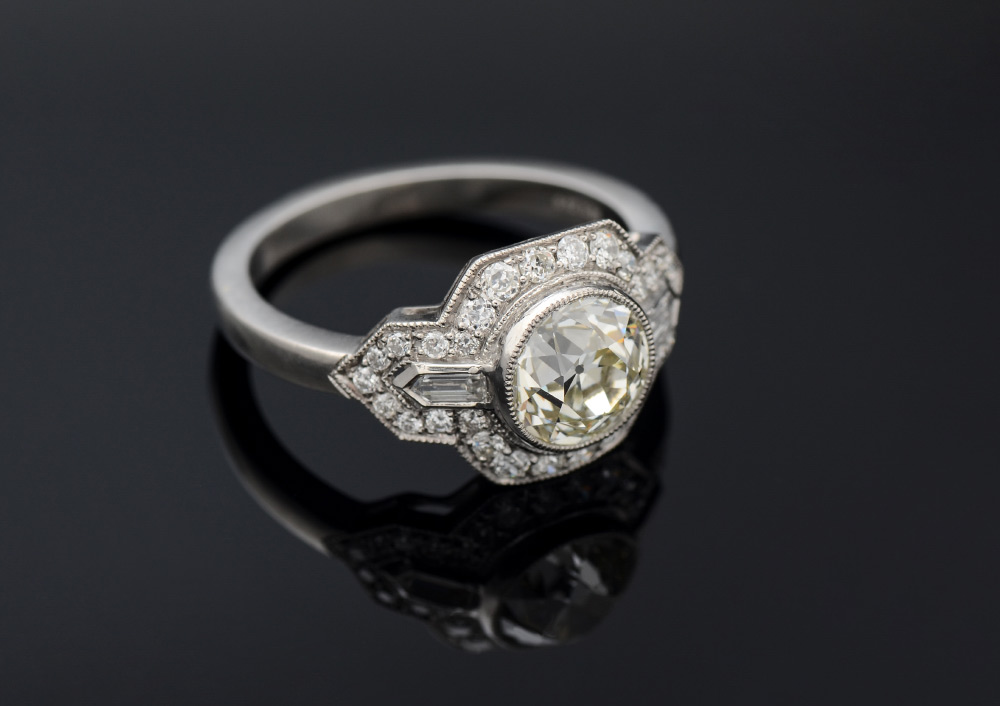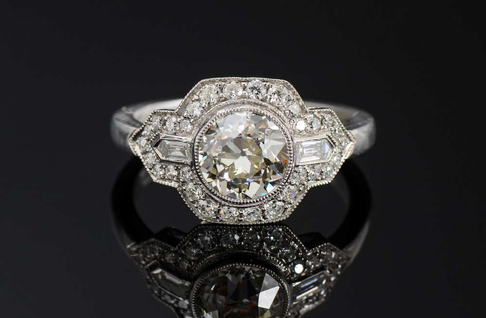 SOPHIA D ART DECO REVIVAL PLATINUM RING: At the center is a 1.41 Ct Old European round cut bezel set diamond of VS1 clarity and 0-P light yellow in color. The additional 30 round brilliant and 2 trapeze cut diamonds total .42 Ct, these smaller stones are VS in clarity and G-H color. Size 6.25. Weight 5.2 grams. Sold with current Atlanta Gemological GIA graduate's appraisal for $8,400.