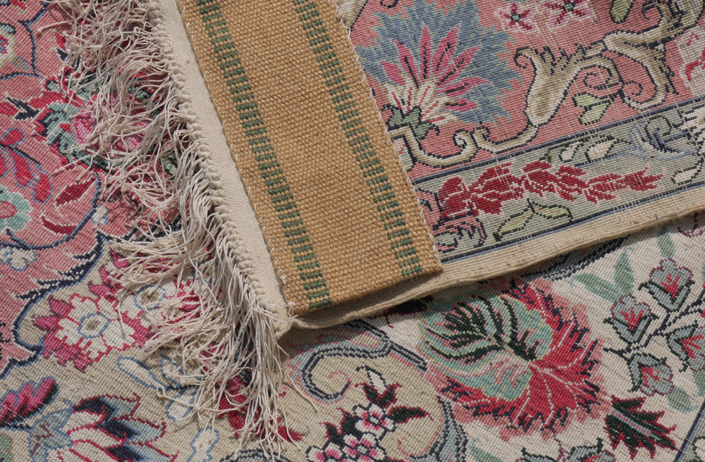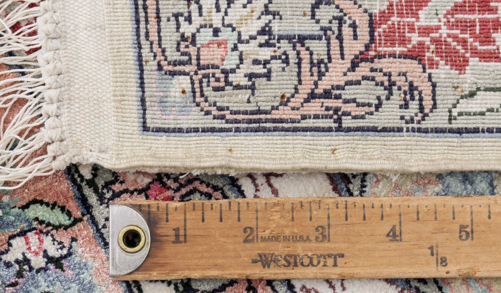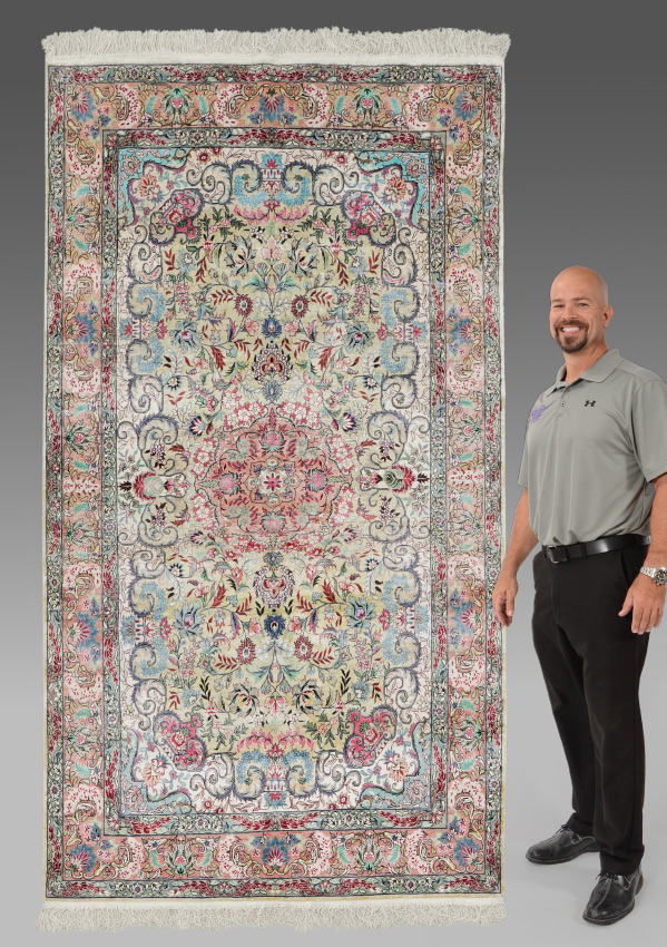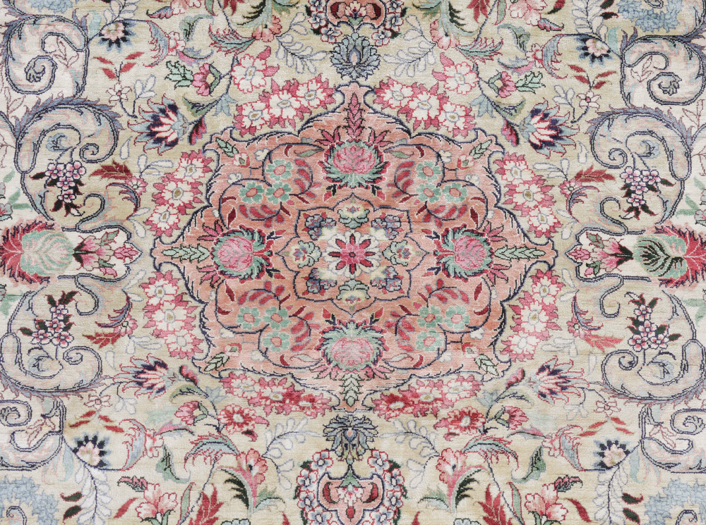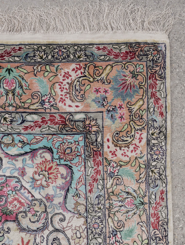 APPROX. 10-15 YR. OLD CHINESE PERSIAN DESIGN HAND KNOTTED FAUX SILK RUG, 5' x 8'4'': This Sino-Persian rug is woven with a Qum design. The overall soft pastel colors used combined with the delicacy of the motifs renderings makes this an appealing, luscious rug. The central medallion combines pale peach, pink, pistachio green, and grey-blue and rests on a pale yellow field. The delicate vines and tendrils that link the other patterns are done in a pale grey-blue. They also help to delineate the added panels of pink, turquoise, and white that edge the main field. The main border has the same colors found in the central medallion. Condition is good. There is some abrash or color change in the pale yellow field that isn't objectionable. Appraised Retail Replacement value in 2002 $9750.