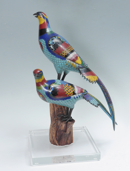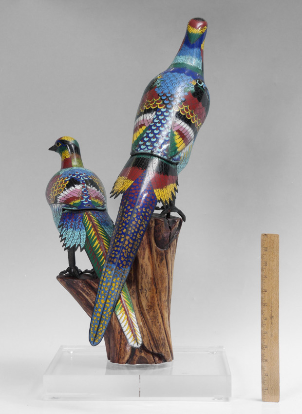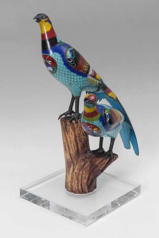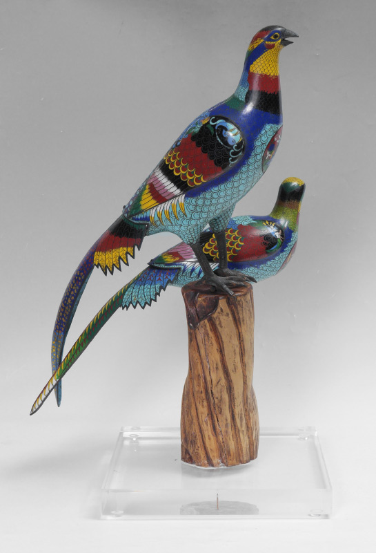 PAIR LARGE PERCHED CHINESE CLOISONNE PHEASANTS: Multi-hued pair perched on a wood stand with Lexan base. Note detailed dragon medallion to chest. One bird 25'' h. x 16'' x 6'', the other 9'' h. x 23'' x 5 1/2''. Overall 29'' h. assembled, base 13 1/2'' x 13 1/2''.