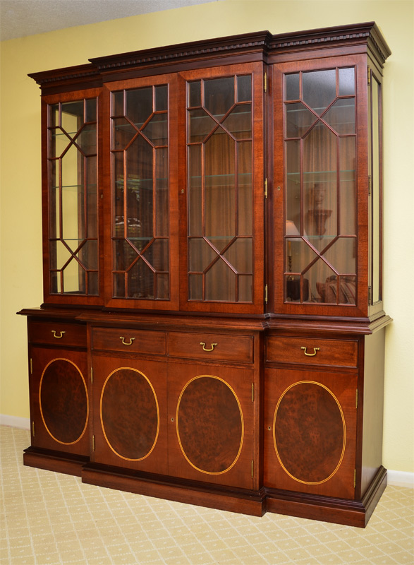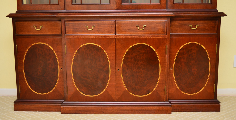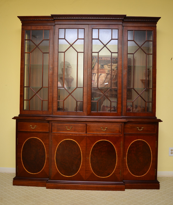 MAHOGANY BREAKFRONT DISPLAY CABINET: Dentil molding over 4 glass doors with fretwork, glass shelves. Base with 4 drawer over 4 doors, doors with inlaid burl veneer and string accents. 84'' h. x 72'' x 19 1/2''.