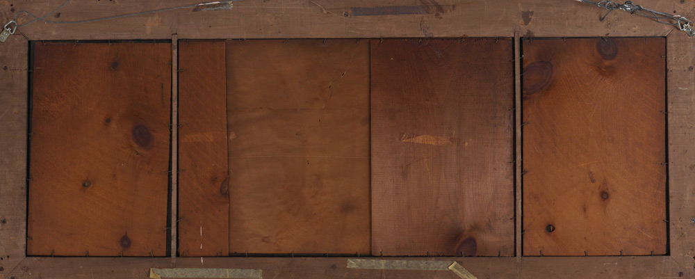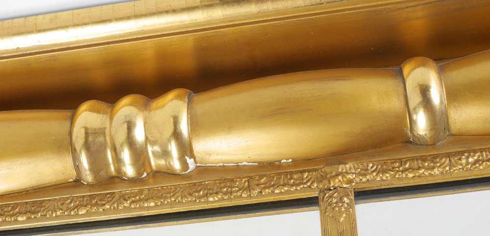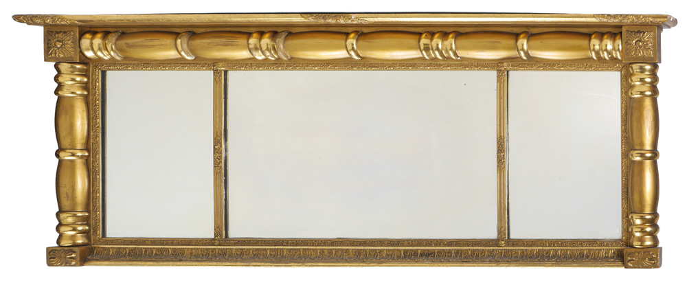 GOLD GILT HORIZONTAL WALL MIRROR: Frame with half column and carved foliate decoration along sides and top, illegible signature on top or crest. Overall measures 25 3/4'' x 64 1/4'' 4''.