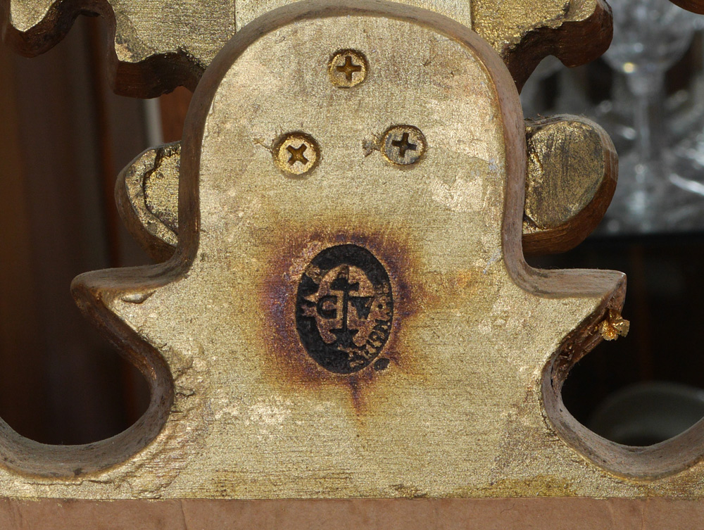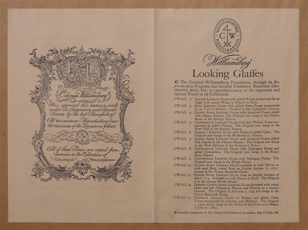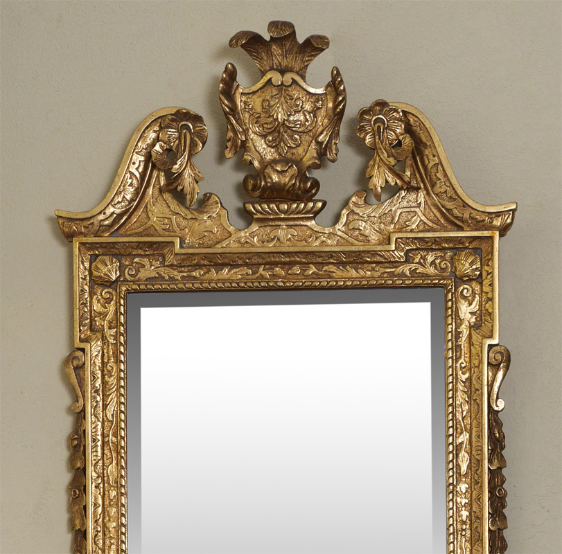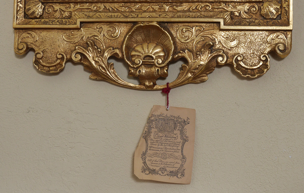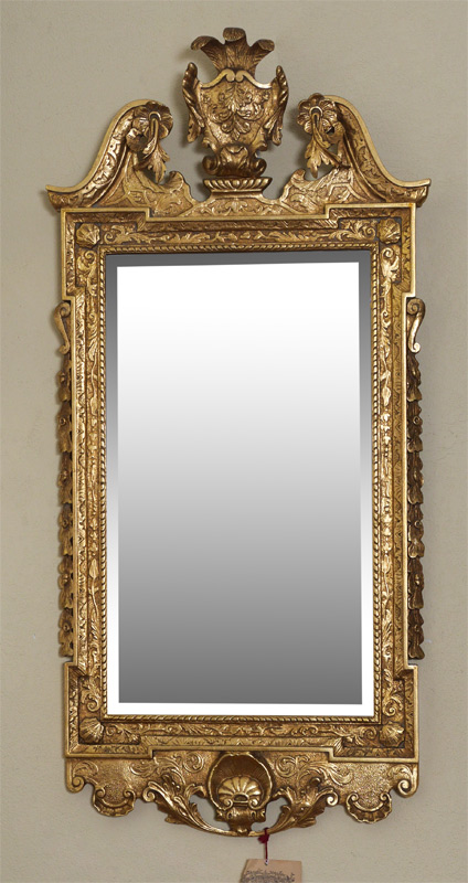 COLONIAL WILLIAMSBURG REPRODUCTION GILT WOOD MIRROR: Broken arch pediment with ornate center finial, carved frame with foliate & shell motif. Base on the frame in the Governors Palace circa 2nd quarter of the 19th Century. OVerall measures 50 1/2'' h. x 25'' x 1 1/2''.
