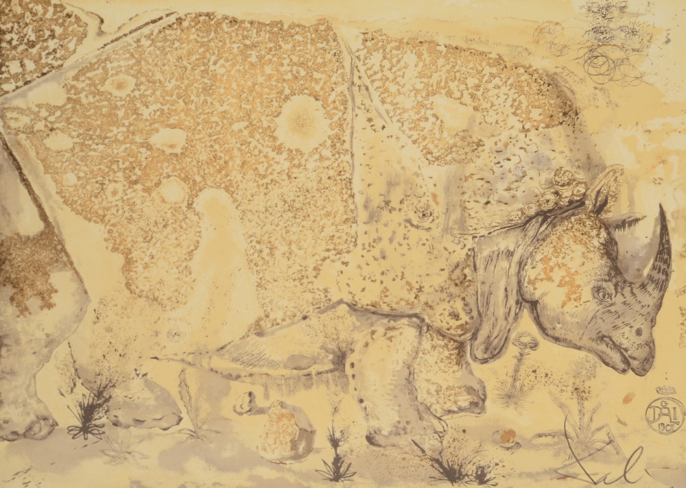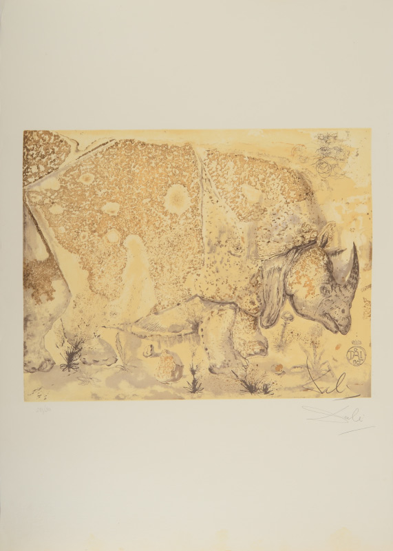 DALI, Salvador, (Spanish, 1904-1989): Rhinoceros, Lithograph, 29 3/4'' x 22 1/4''', signed lower right, numbered 210/300 lower left, monogrammed in the plate lower right, dated 1968, Sala Gaspar watermark, unframed.