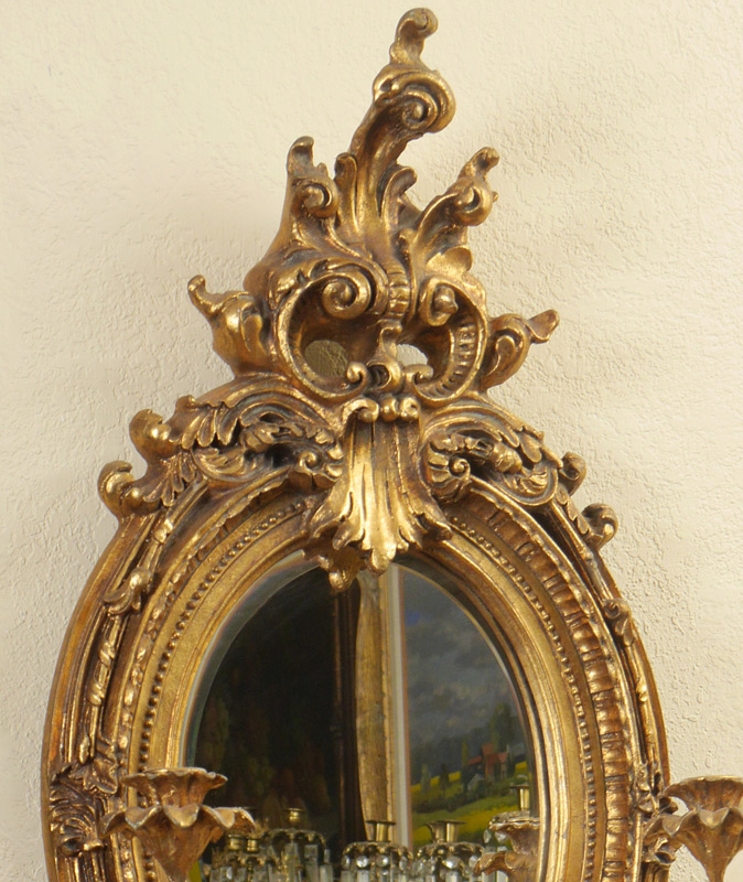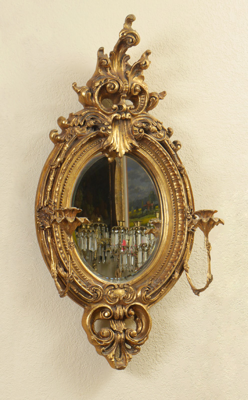 ROCOCO STYLE GILT WOOD WALL MIRROR / SCONCE: Foliate spray crest over carved frame, holds 2 arms hold single candle each. 20th century production, beveled glass mirror, measures 31 1/2'' h. x 16'' x 6 1/2''.