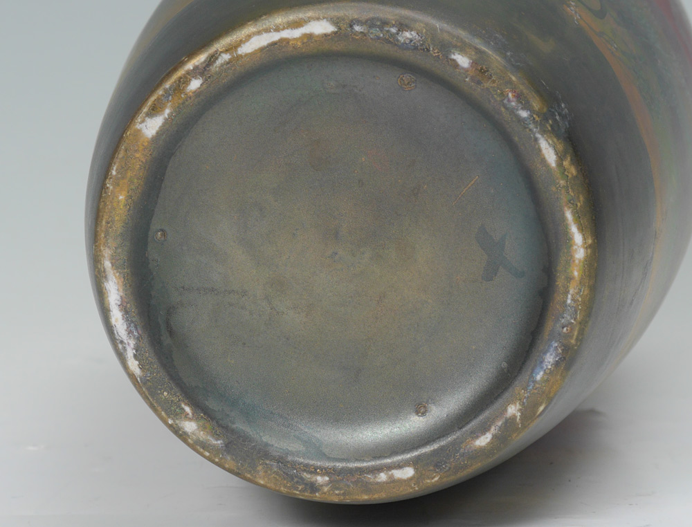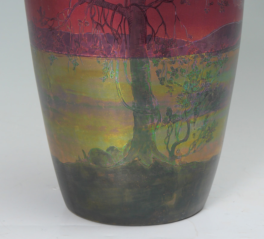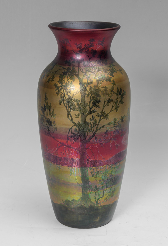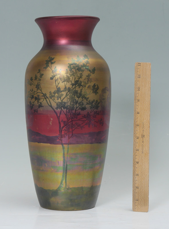 LARGE WELLER LASA LANDSCAPE VASE: Baluster form with Lasa multi-hued glaze, scene of mountainous lakeside landscape with trees and clouds. Overall measures 15 3/4'' h. x 7''.