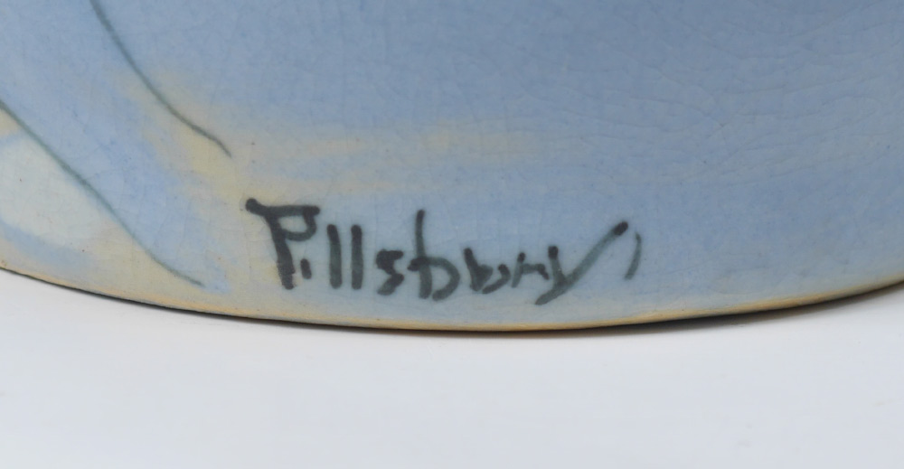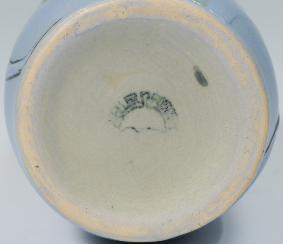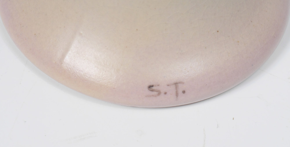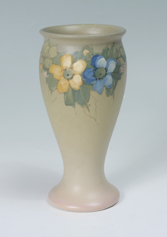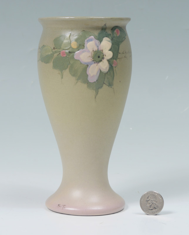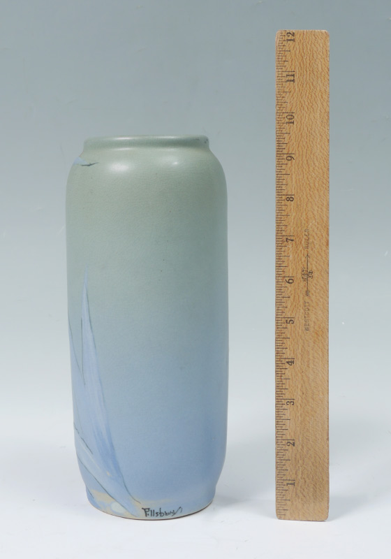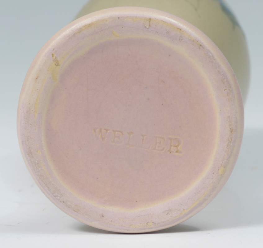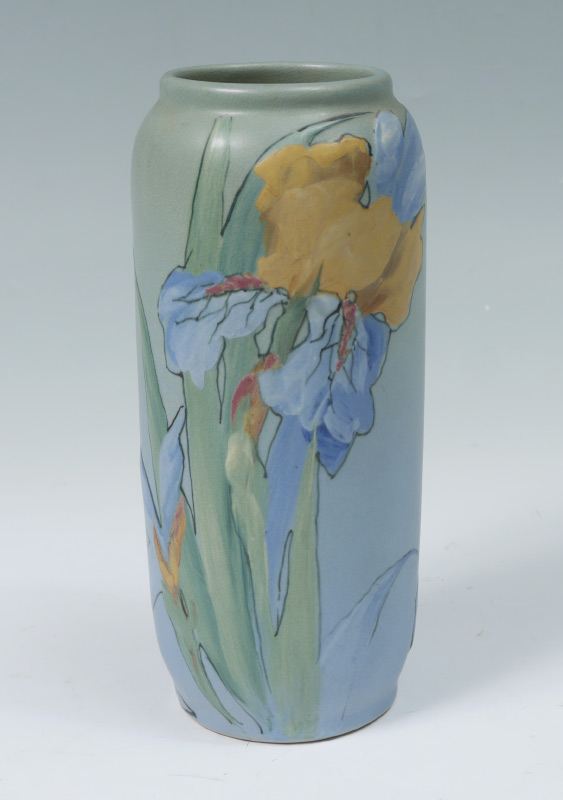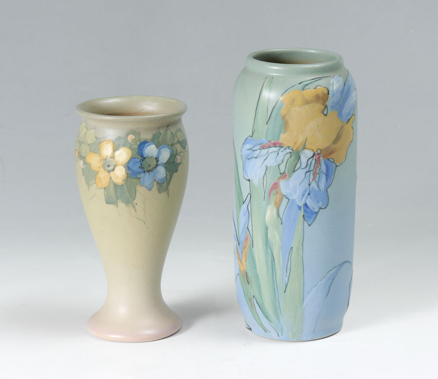 2 WELLER HUDSON FLORAL VASES: 2 pieces total to include 1) Hester Pillsbury artist Hudson cylinder vase with iris decoration, stamped Weller mark on base, signed near base. 9 1/2'' h. x 4''. 2) Sarah Timberlake artist flared vase with floral garland motif. Impressed Weller on base, signed ST near base. 7 3/4'' x 4''.