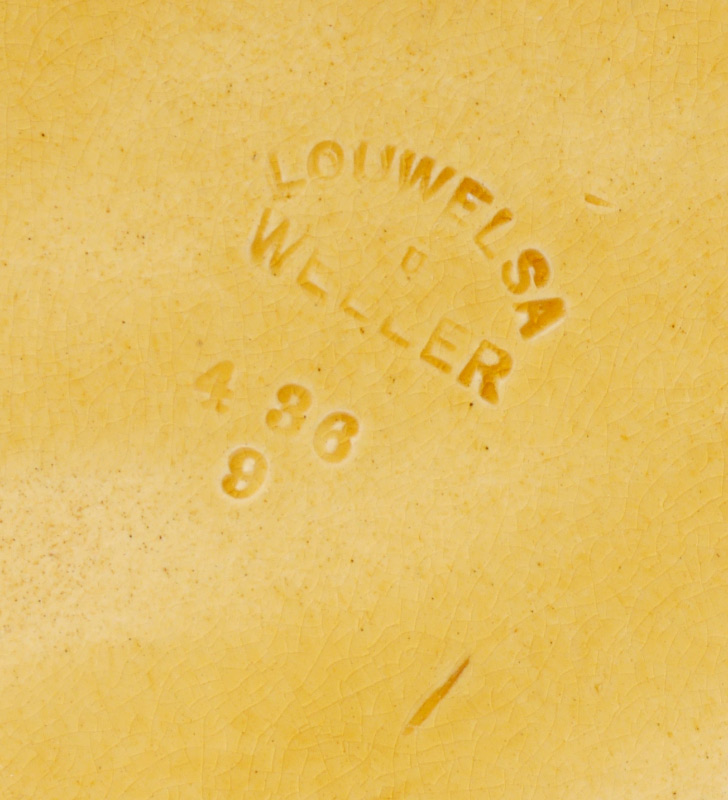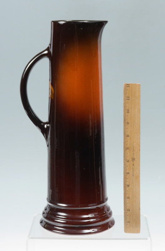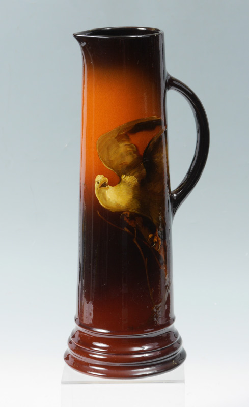 TALL WELLER LOUWELSA EAGLE PITCHER: Tall handled pitcher or tankard decorated with bald eagle on branch, impressed ''Louwelsa Weller, 436, 9'' on base. Overall measures 15 3/4'' x 6''.