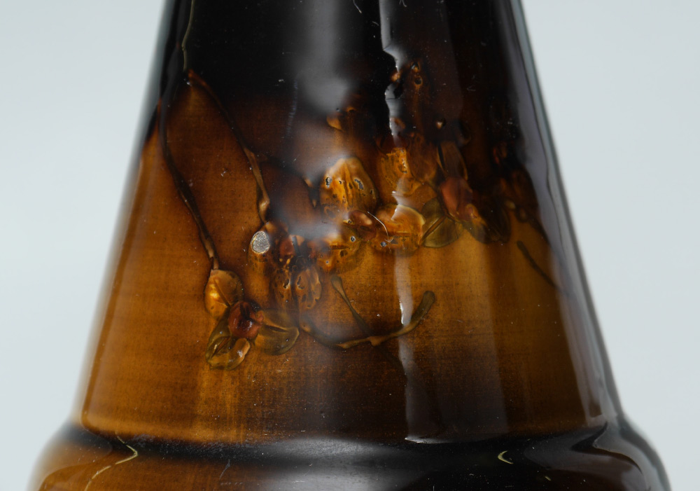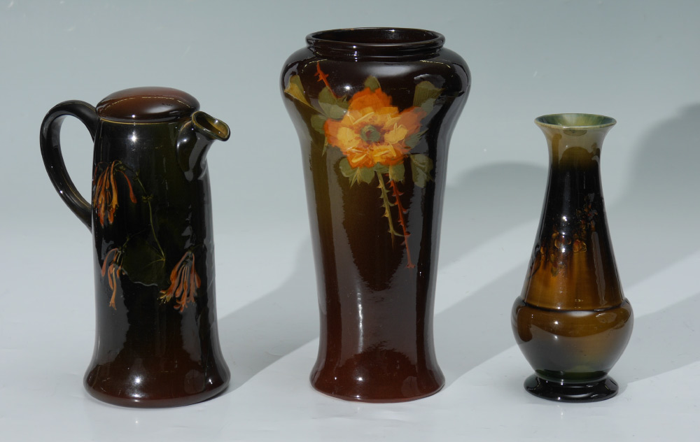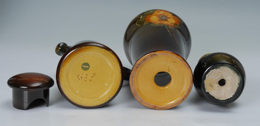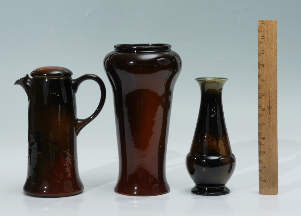 3 PIECE STANDARD GLAZE ART POTTERY: 3 pieces total to include 1) 1893 Rookwood vase with raised floral decoration, base drilled for lamp, 8'' h. x 3 1/2''. 2) 1894 Rookwood chocolate pot #772, floral decorated and signed by artist Olga Geneva Reed, retains original lid. Marked on base and original retailer Burley & Co., Chicago sticker. 9'' h. x 6 1/2''. 3) Unmarked flared lamp base with glazed hole at base, floral decoration. Measures 10 1/2'' h. x 5 1/4''.
