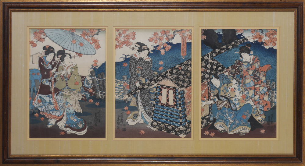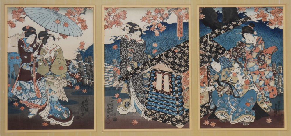 JAPANESE WOODBLOCK TRIPTYCH OF GEISHAS: Each print measures 14'' x 10'', in custom frame, 21 1/2'' x 39 1/2''.