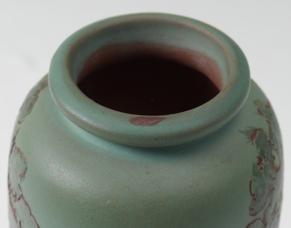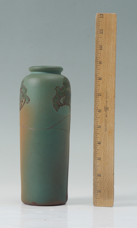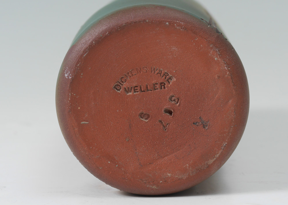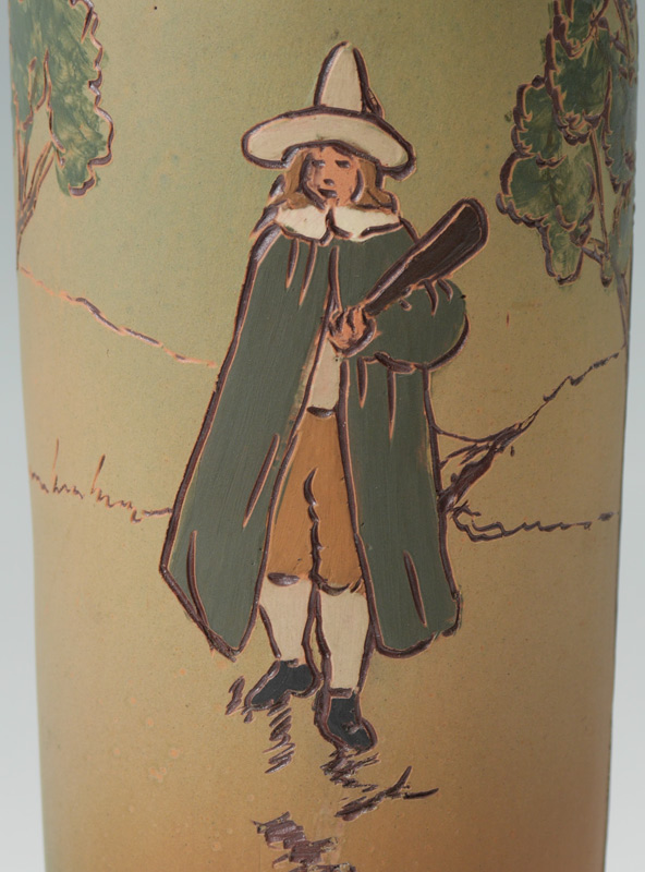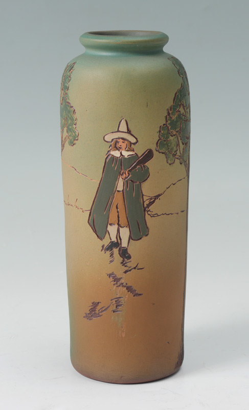 WELLER DICKENSWARE CYLINDER VASE: Incised decoration of hunter with blunderbuss rifle and trees, marked on base with Dickensware Weller and illegible number. 8 3/4'' h. x 3 1/4''.