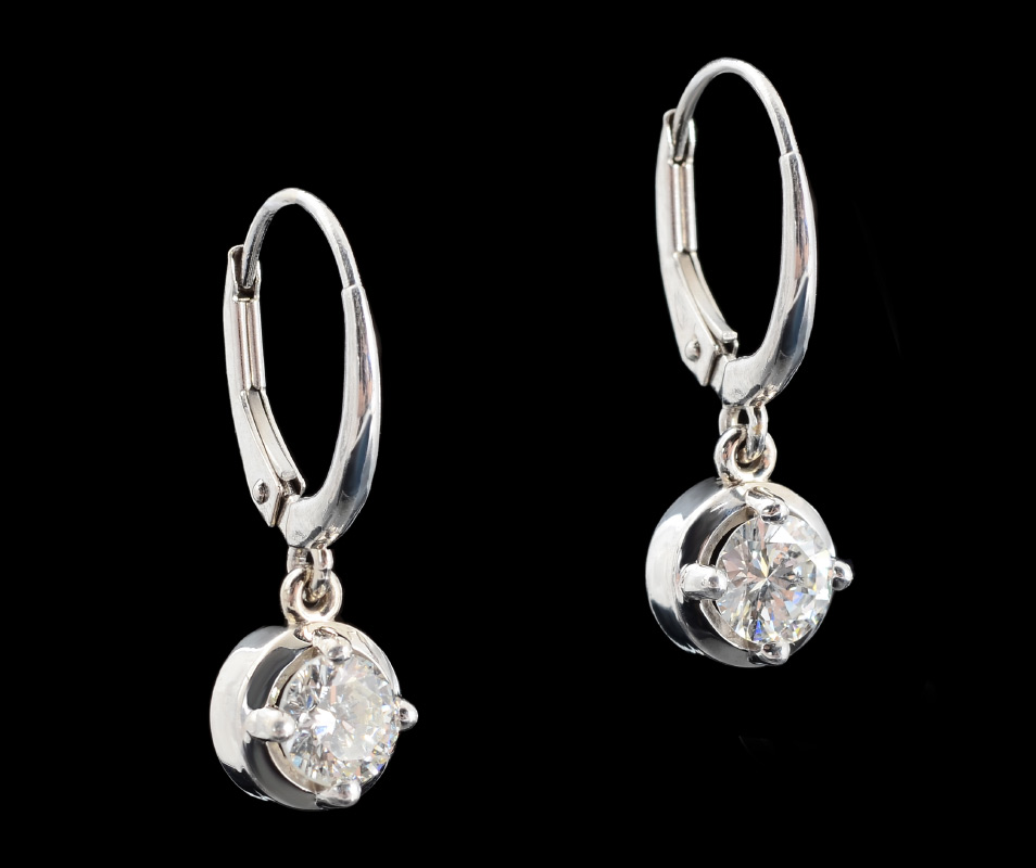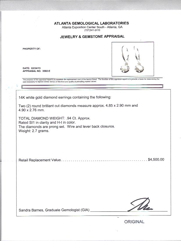 DIAMOND DROP EARRINGS: 14K white gold wire and lever back earrings with 2 round brilliant diamonds totaling approx. .94 Ct., rated SI1 clarity and H-I color. Sold with current Atlanta Gemological GIA graduate's appraisal for $4,500.