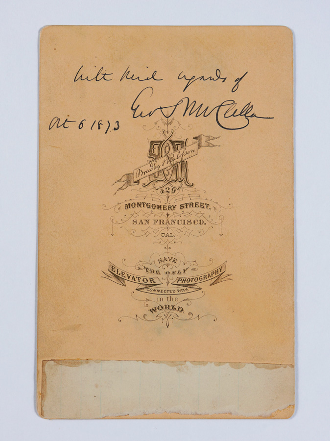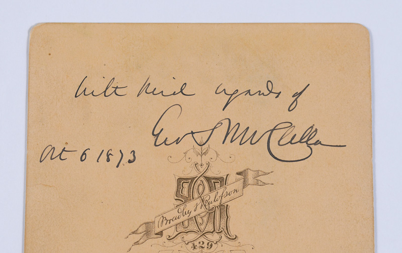 GENERAL GEORGE MCCLELLAN SIGNED CABINET PHOTO: Cabinet card photograph signed on back in pen ''With kind rgards of Geo. McClellan, Oct 6 1873''. Famous Civil War General, the McClellan saddle is named after him. Card 6 3/8'' x 4 1/4''.