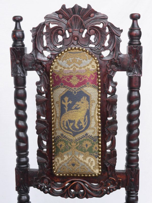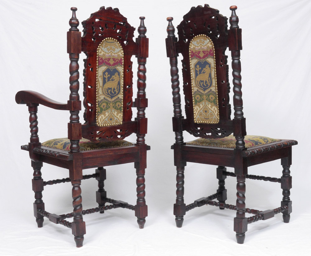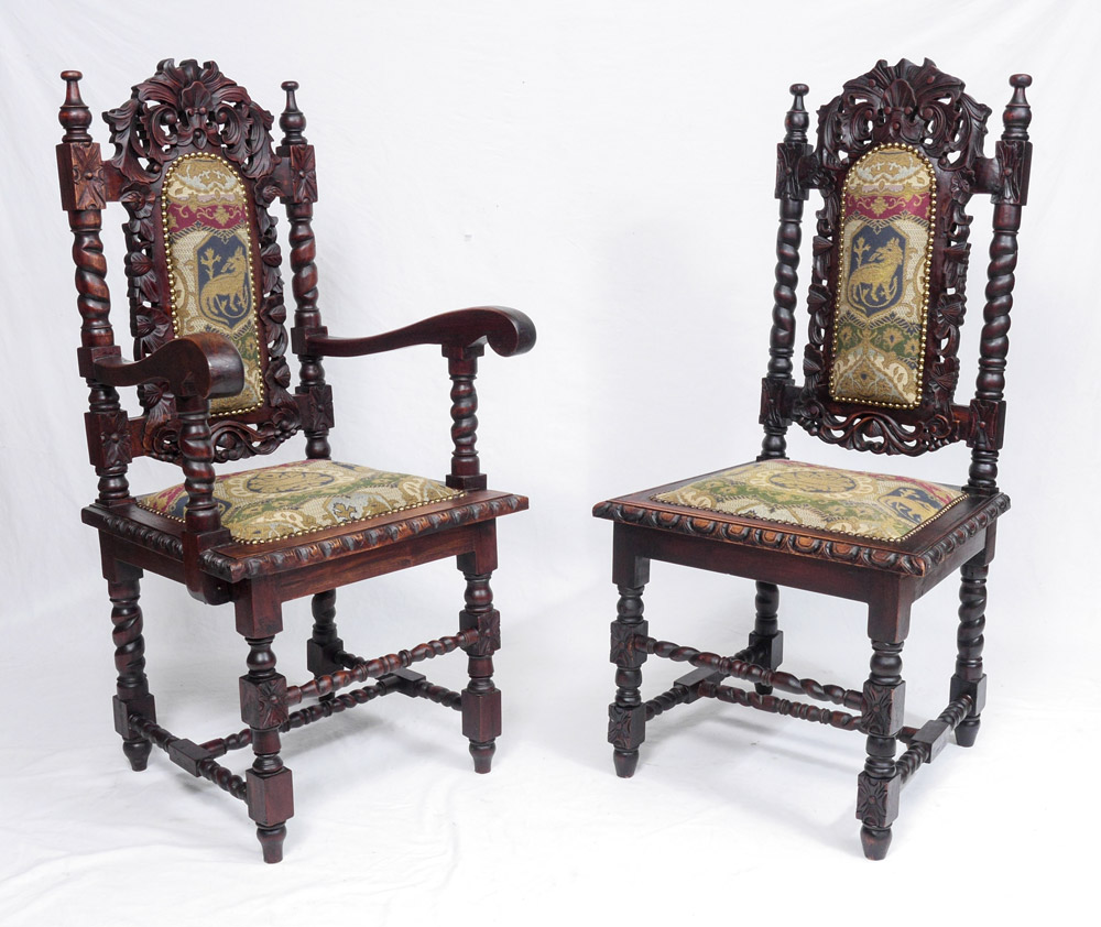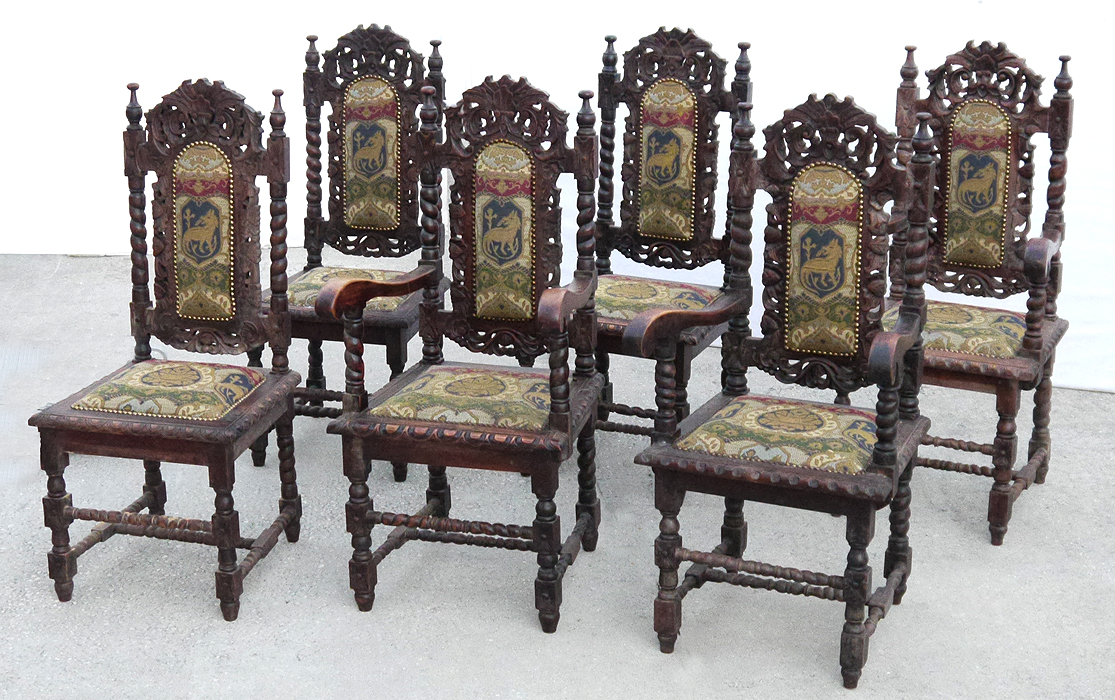 SET OF SIX HEAVILY CARVED JACOBEAN STYLE UPHOLSTERED DINING CHAIRS: The peaked leaf carved crest over an upholstered splat flanked by rope twist side supports with upholstered seats in carved wooden frames on turned and block legs joined by rope twist and block stretchers. Arm chair measures approx. 46''h. x 22''d x 22''w.