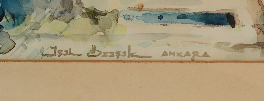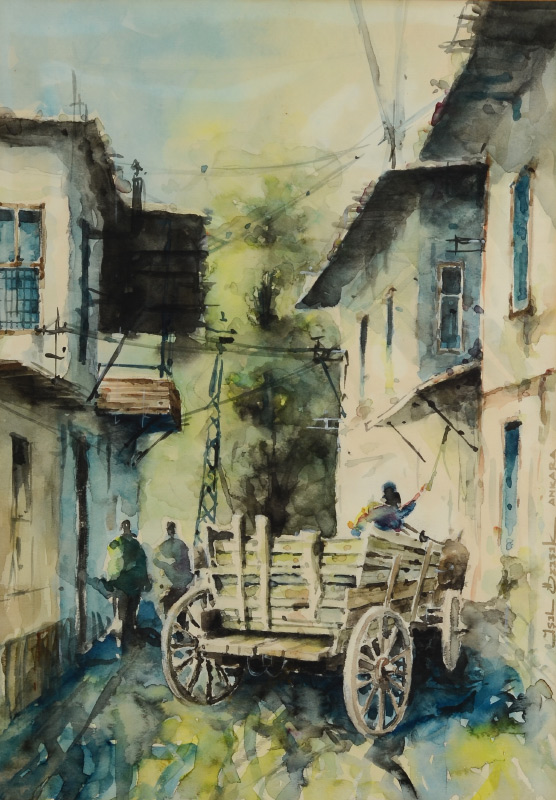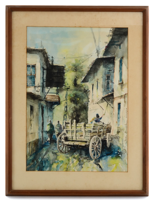 OZISIK, Isil, (Turkish, 1939- ): Ankara Street Scene with Cart, Watercolor, sight size 18 1/2'' x 12 1/2'', signed in the right margin, framed, 24'' x 18''.