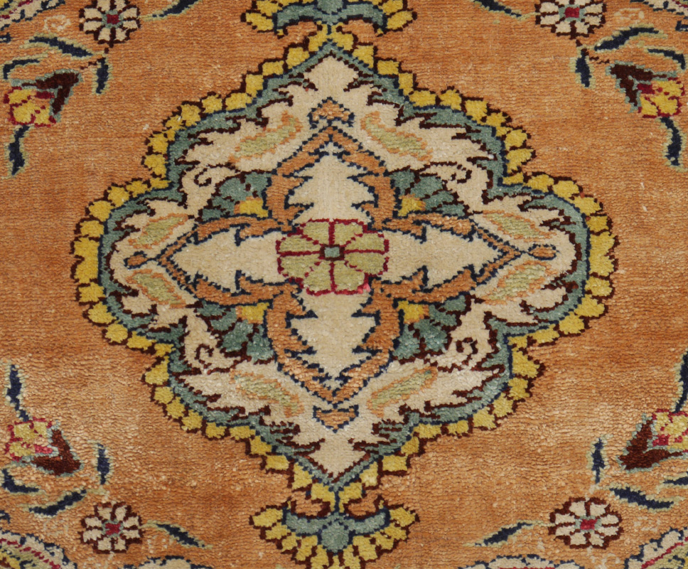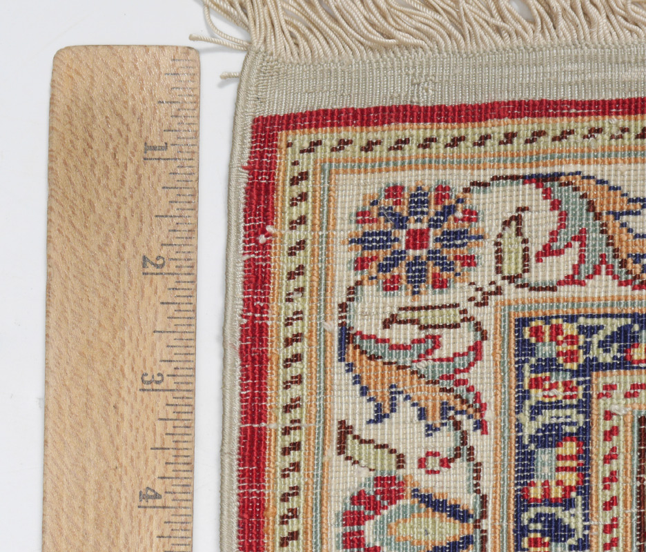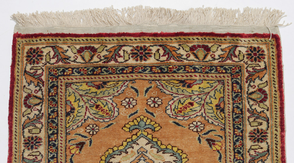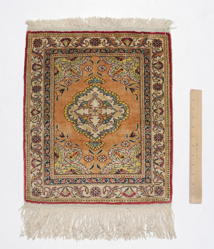 APPROX. 15-25 YR OLD TURKISH HEREKE HAND KNOTTED SILK SMALL RUG, 1'4'' x 1'6'': This little jewel has an open pale peach field with a white ground central medallion that has pale yellow, red, and turquoise accents. The four corners of the field are filled with a leaf and vine design in shades of pale yellow and white with red and blue accents. The multiple small guard borders and the white ground main border complete this pretty little rug. It would be suitable for hanging on the wall or placing on a table top for all to admire. Condition is good.