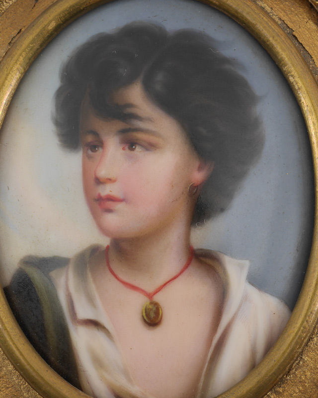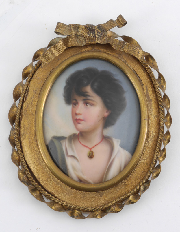 MINIATURE PAINTING ON PORCELAIN OF A YOUNG BOY: Oval 3'' x 2 1/4'', metal framed, 5'' x 4''.