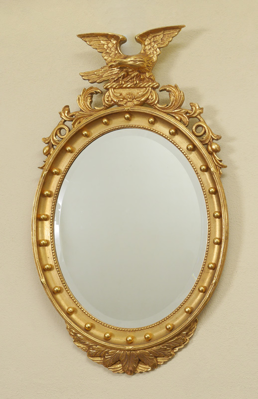 LARGE CARVED EAGLE GILT WOOD WALL MIRROR: Carved eagle crest over oval frame with applied ball decoration, lower foliate crest, beveled glass mirror. Overall measures 46 1/2'' h. x 27''.