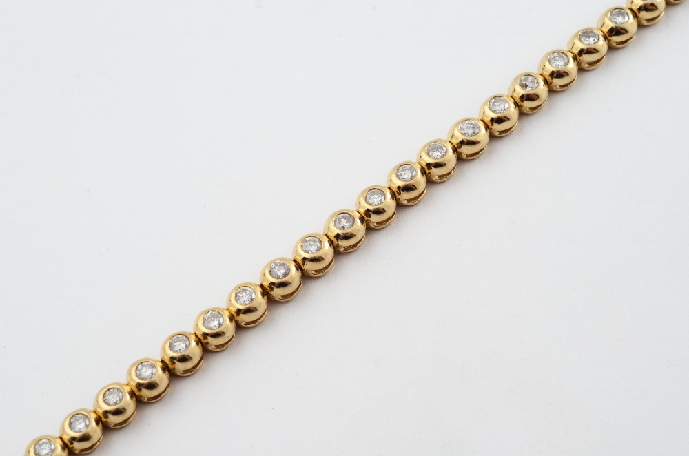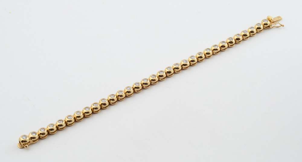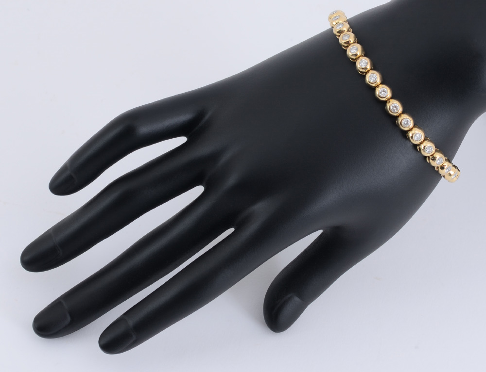 4 CT DIAMOND TENNIS BRACELET: 14K yellow gold diamond bracelet contains 31 round brilliant cut diamonds totaling approx. 4.00 Ct., rated SI in clarity and H-I in color. The diamonds are gypsy set. Locking closure with figure eight safety clasp. Weight: 22.2 grams. Length: 7''