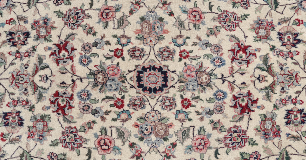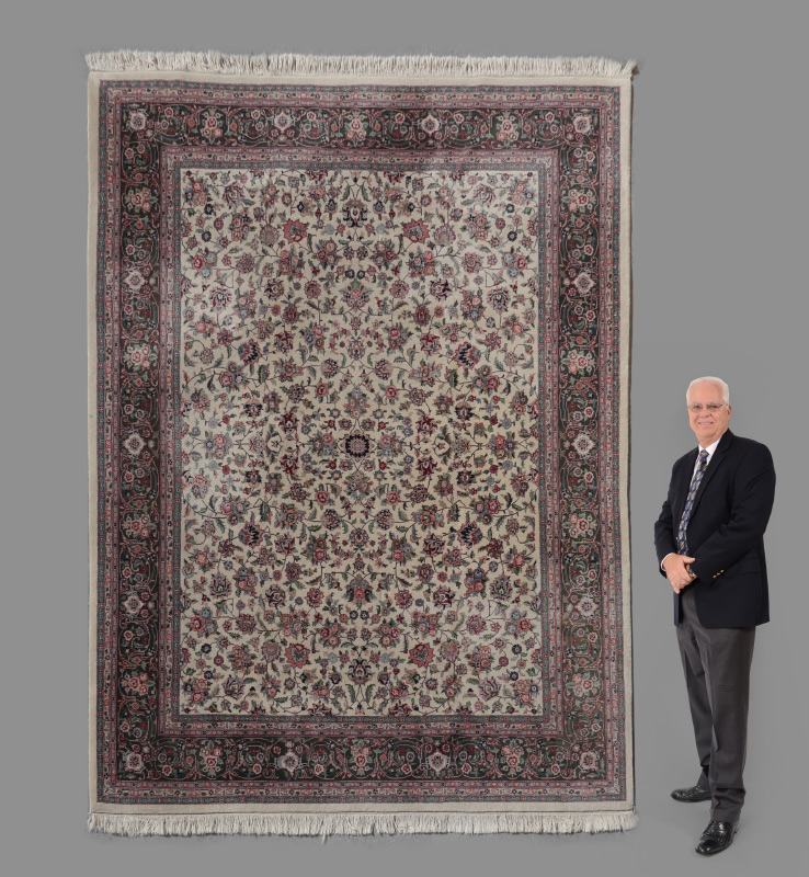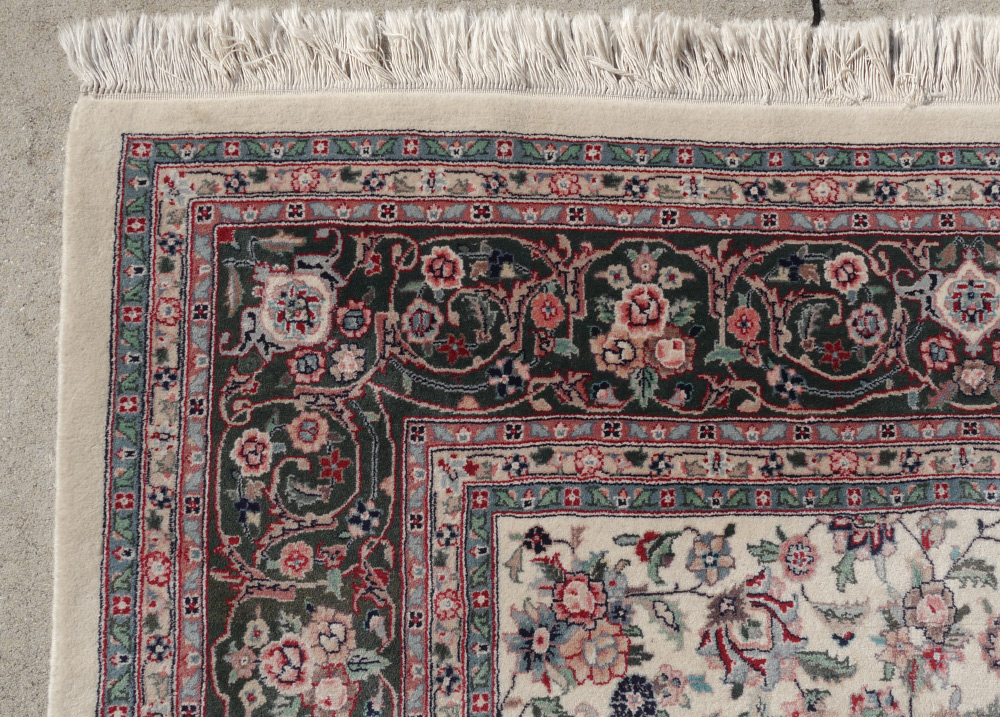 APPROX 20-30 YR OLD SINO-PERSIAN HAND KNOTTED WOOL RUG, 8'1'' X 10'4'': This room size rug in a Kashan pattern looks like a larger rug than it is because of the white colored field that is covered with small flowers and palmettes linked by leafy vines and no central medallion. The main colors used are shades of pink, green, and white with accents of blue. The large main border has a green ground, a very desirable decorator color since it is not commonly found on Persian rugs. Condition is good.
