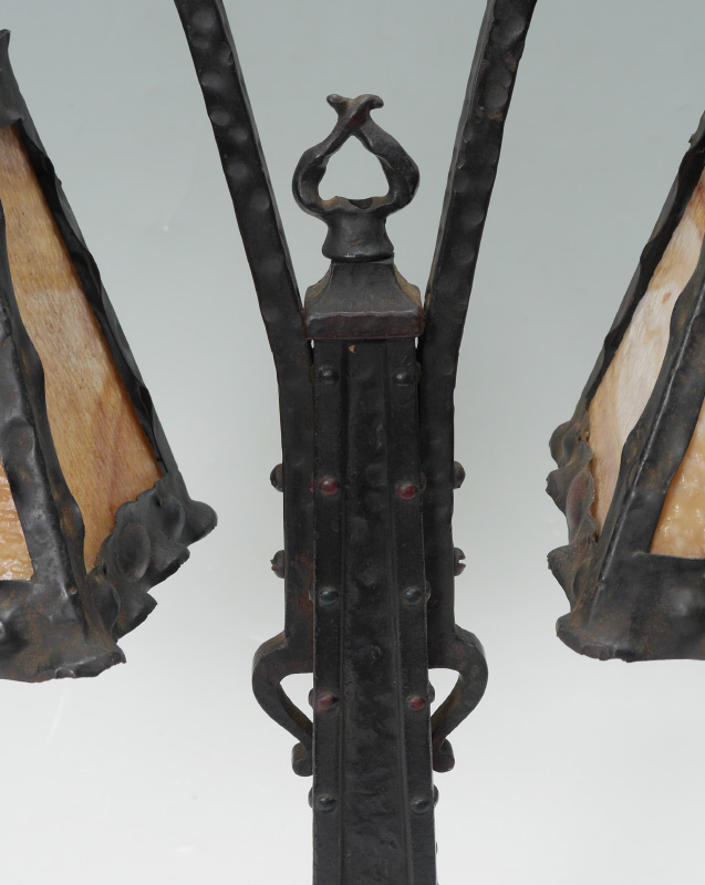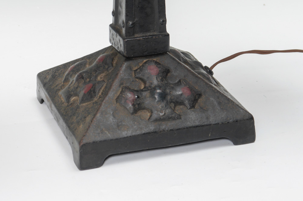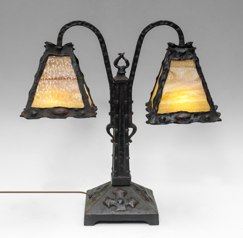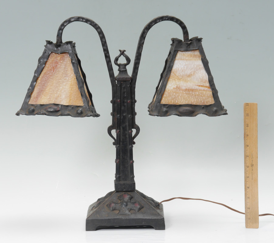 CAST IRON ARTS & CRAFTS 2 LIGHT TABLE LAMP: Cast iron base with cross designs, arts & crafts style square pedestal body, 2 lights with patinated metal and caramel slag glass shades. Overall measures 20 1/4'' h. x 20'' x 8''.