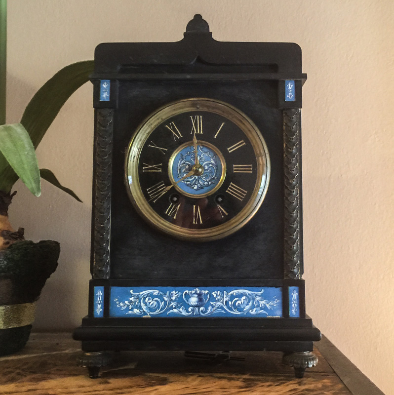 FRENCH SLATE & PORCELAIN MANTLE CLOCK: Black slate case with shaped top, front with blue porcelain tile inserts & applied decoration, brass feet. Black slate dial with incised Roman numerals, blue porcelain insert, traces of dealers name remains. Continental time & strike movement. Overall measures 14 1/4'' h. x 9 1/4'' x 5 3/4''.
