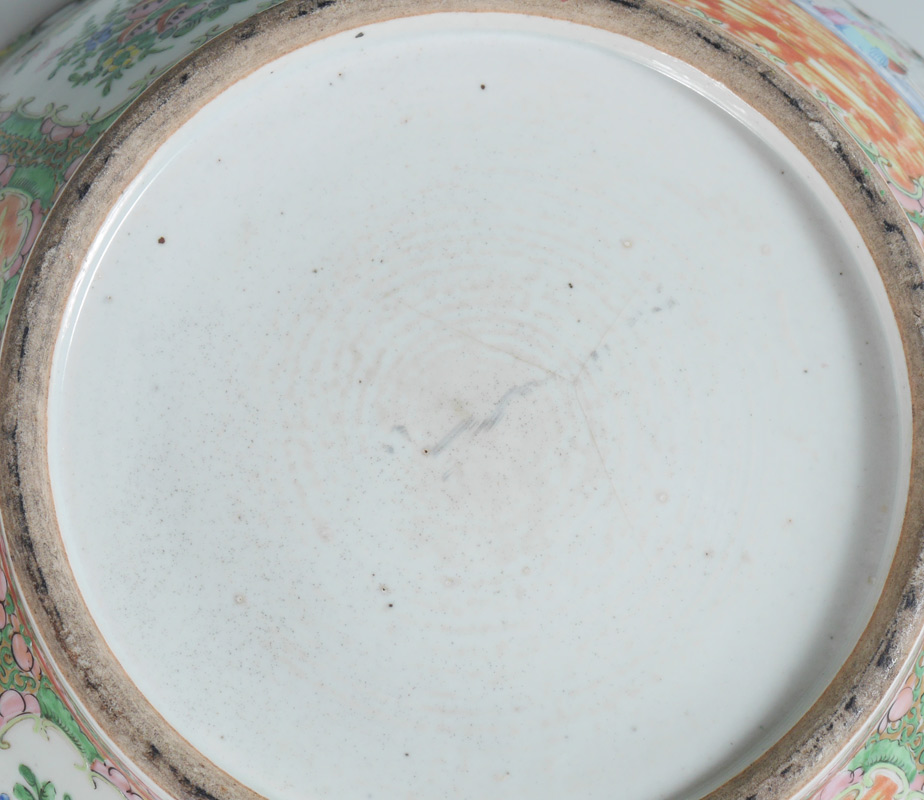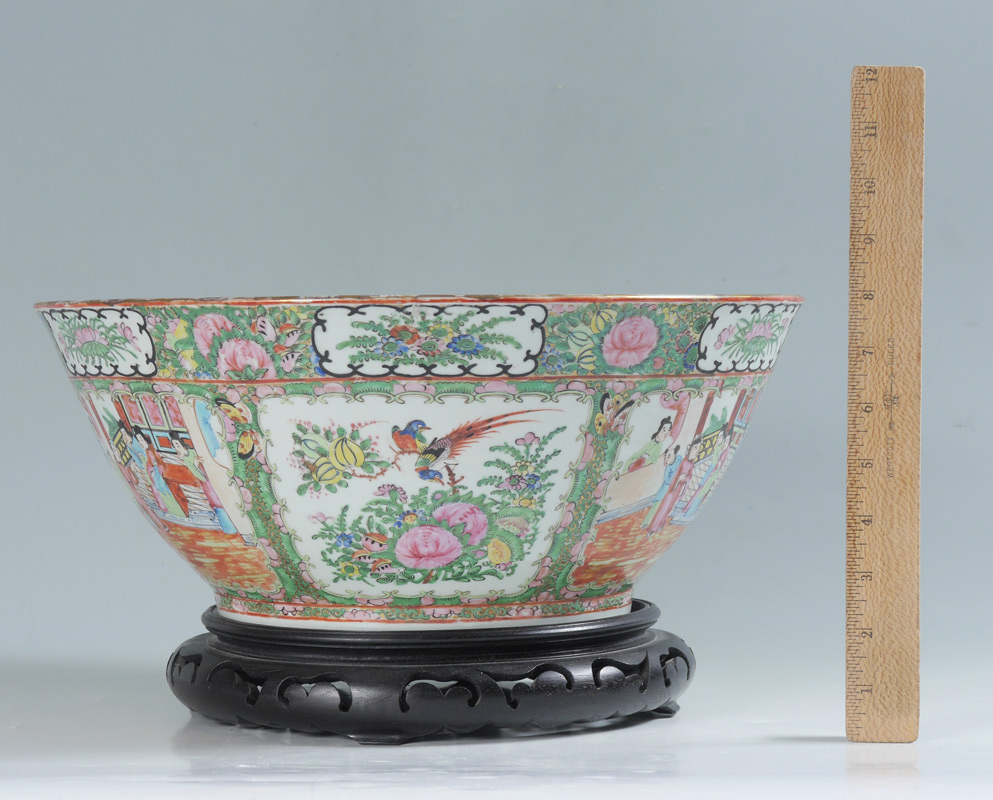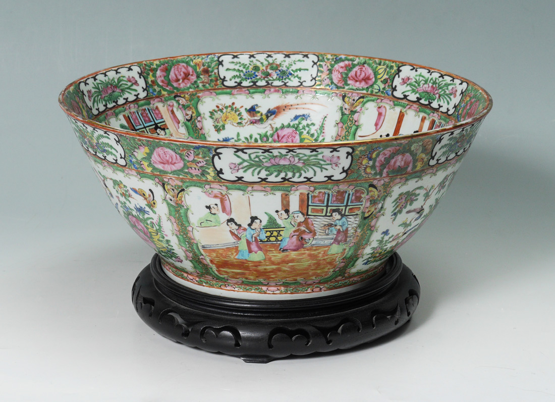 19TH C CHINESE ROSE MEDALLION PUNCH BOWL: Measures approx. 14 1/2'' dia. x 6''. Sold with the wood stand.