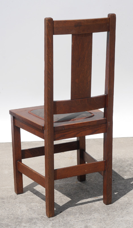 SIGNED CHARLES LIMBERT MISSION OAK 6 CHAIRS: Arts & Crafts era, applied leather to seats. Marked under seats, overall measures 37'' x 17'' x 17''.