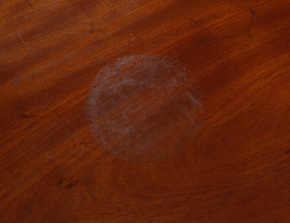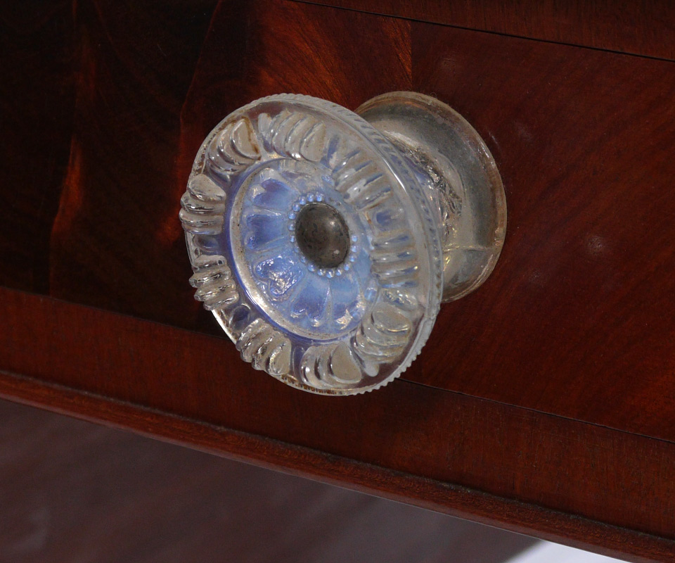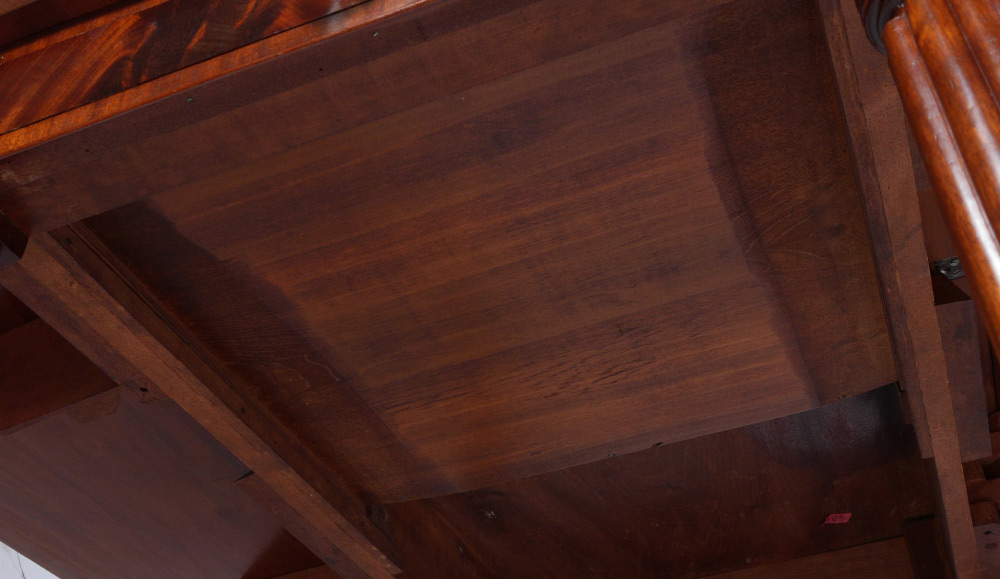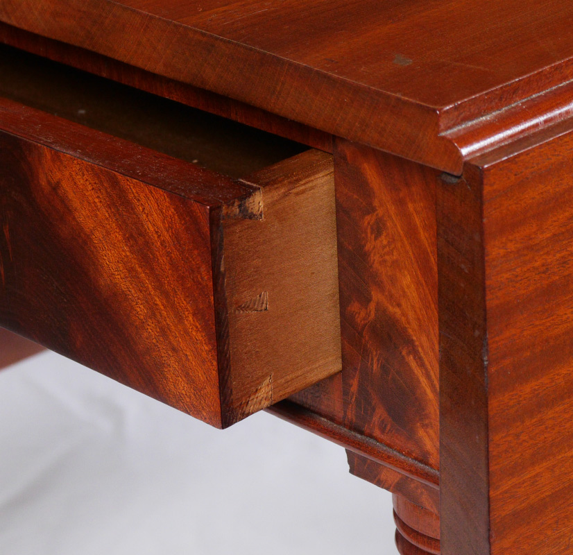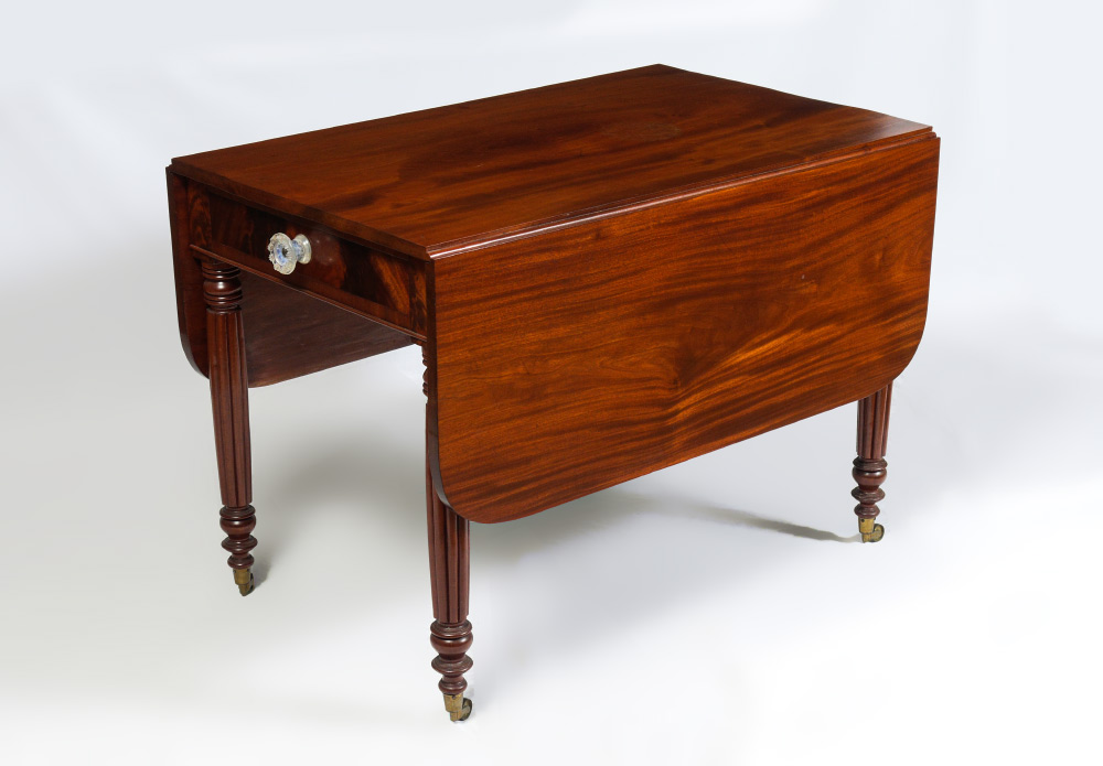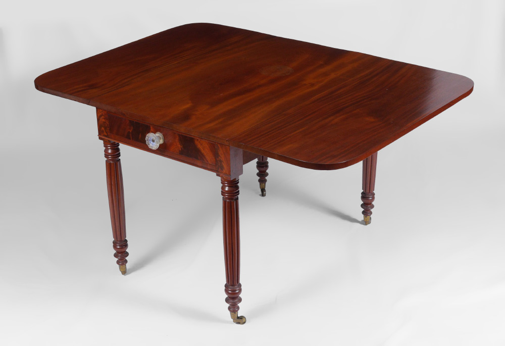 19TH CENTURY MAHOGANY DROP LEAF TABLE: Drawer with original glass knob, turned and fluted legs. Overall measures 29 1/4'' h. x 26 1/2'' x 40 1/2''. Leaves 16''.