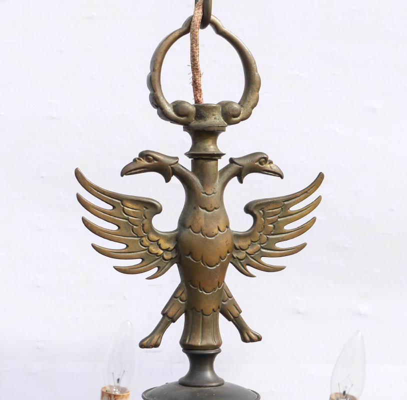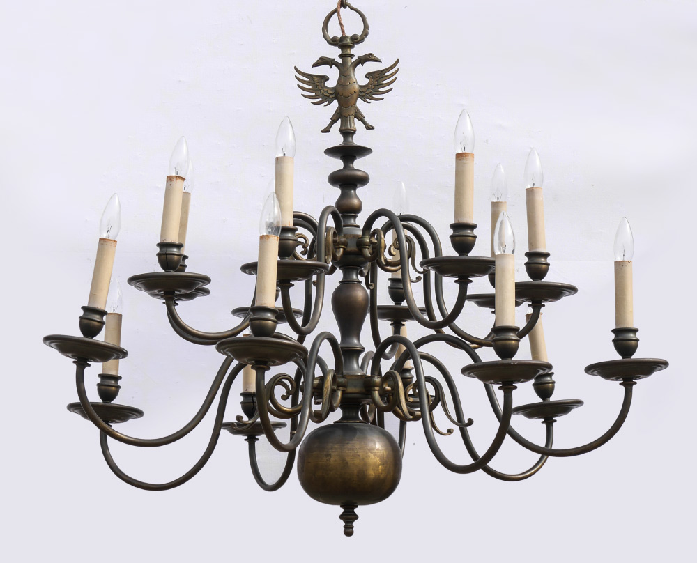 BRONZE RUSSIAN 16 LIGHT CHANDELIER: Imperial Russian double headed eagle finial over 16 scroll arms, lower round bottom finial. Overall measures approx. 36'' x 40''.