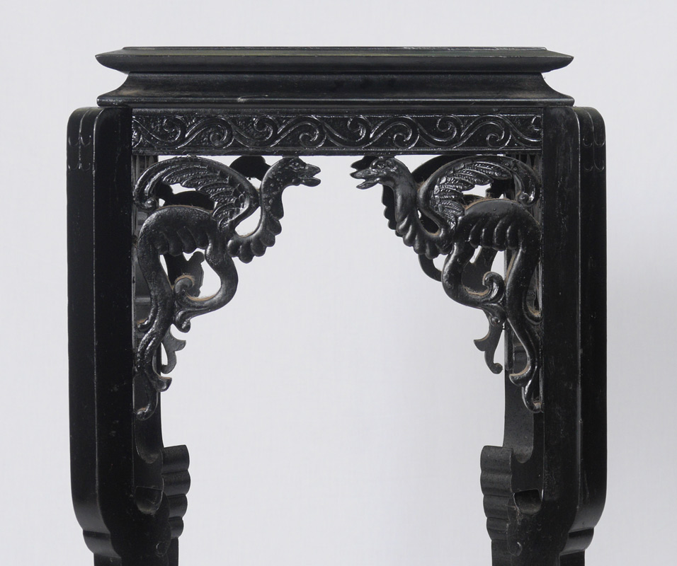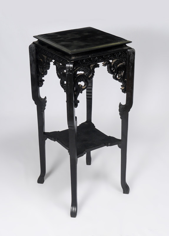 ORIENTAL CARVED DRAGON PLANT STAND: Ebonized wood, square top over carved skirt with pierced carved figural winged dragons at corners. Shaped legs, open lower shelf, overall measures 35 1/4'' x 15 3/4'' x 15 3/4''.