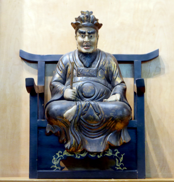 CHINESE PAINT DECORATED CARVED SEATED MAN & CHAIR: Figure of a seated man in lotus position, gilt decorated flowing robe, holding a fan. Painted face, overall measures 20 1/2'' h. x 12 1/2'' x 10''. Sold with diminutive chair, 19 1/2'' h. x 21 3/4'' x 13 1/4''.